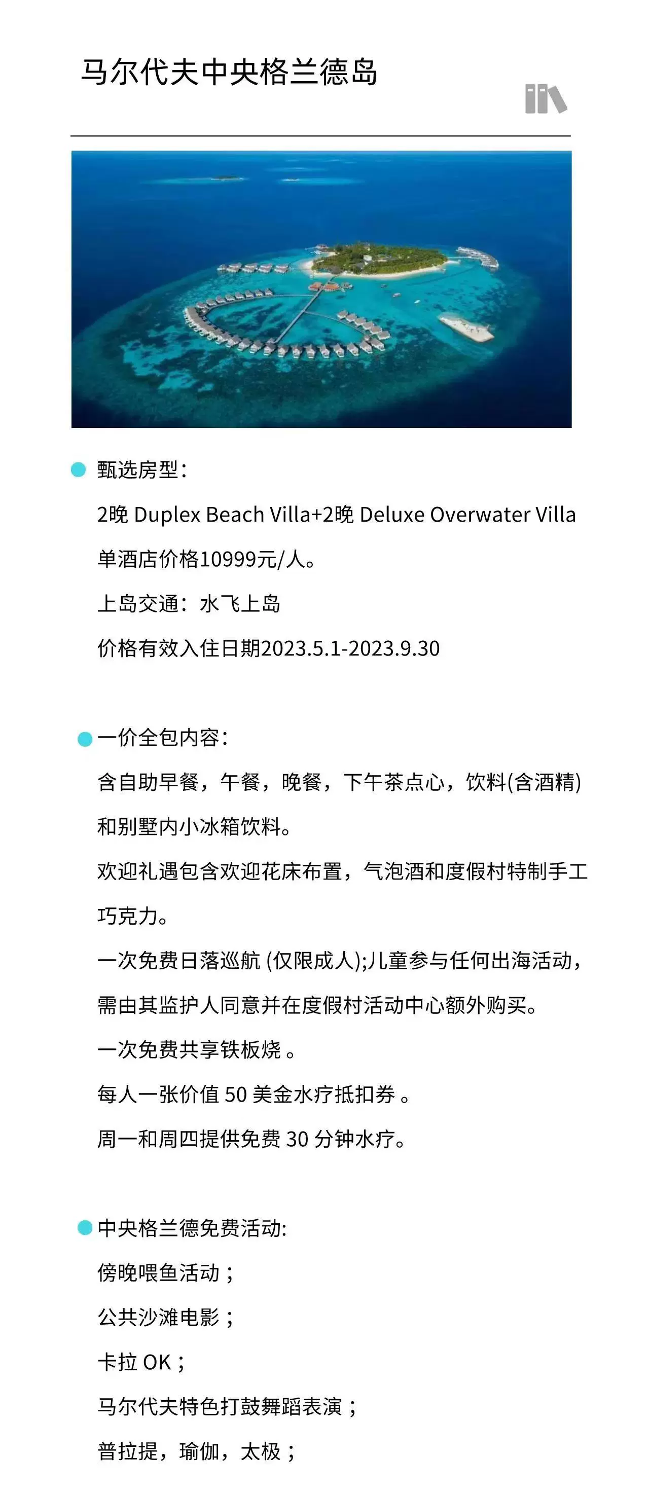 马尔代夫旅游中央格兰德一价全包水飞上岛度假酒店蜜月旅行亲子游