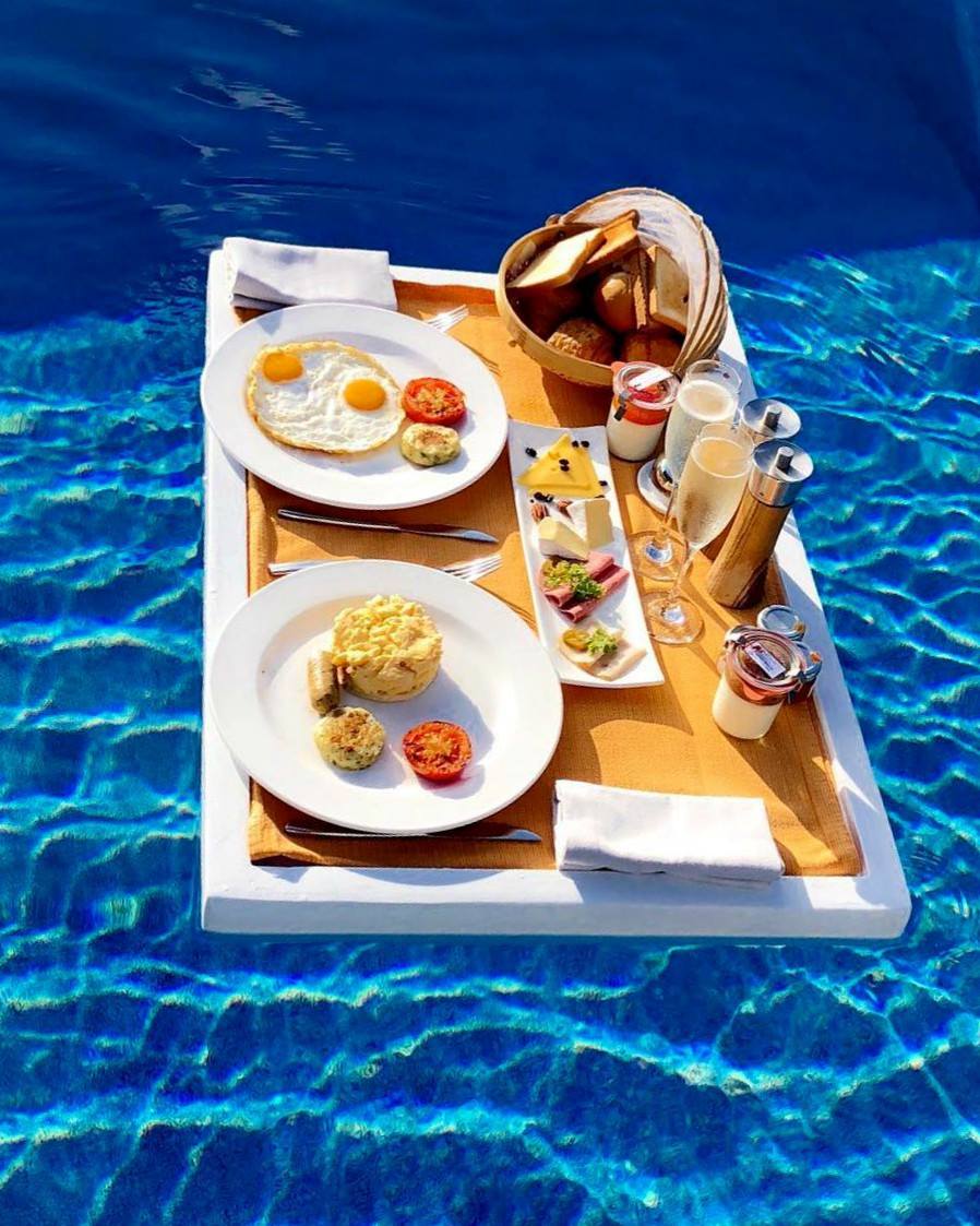 简单来说,漂浮早餐就是工作人员将食物摆好放在托盘里,然后再将托盘放入泳池中,让其漂浮起来~漂浮早餐真的是拍照凹造型的利器。