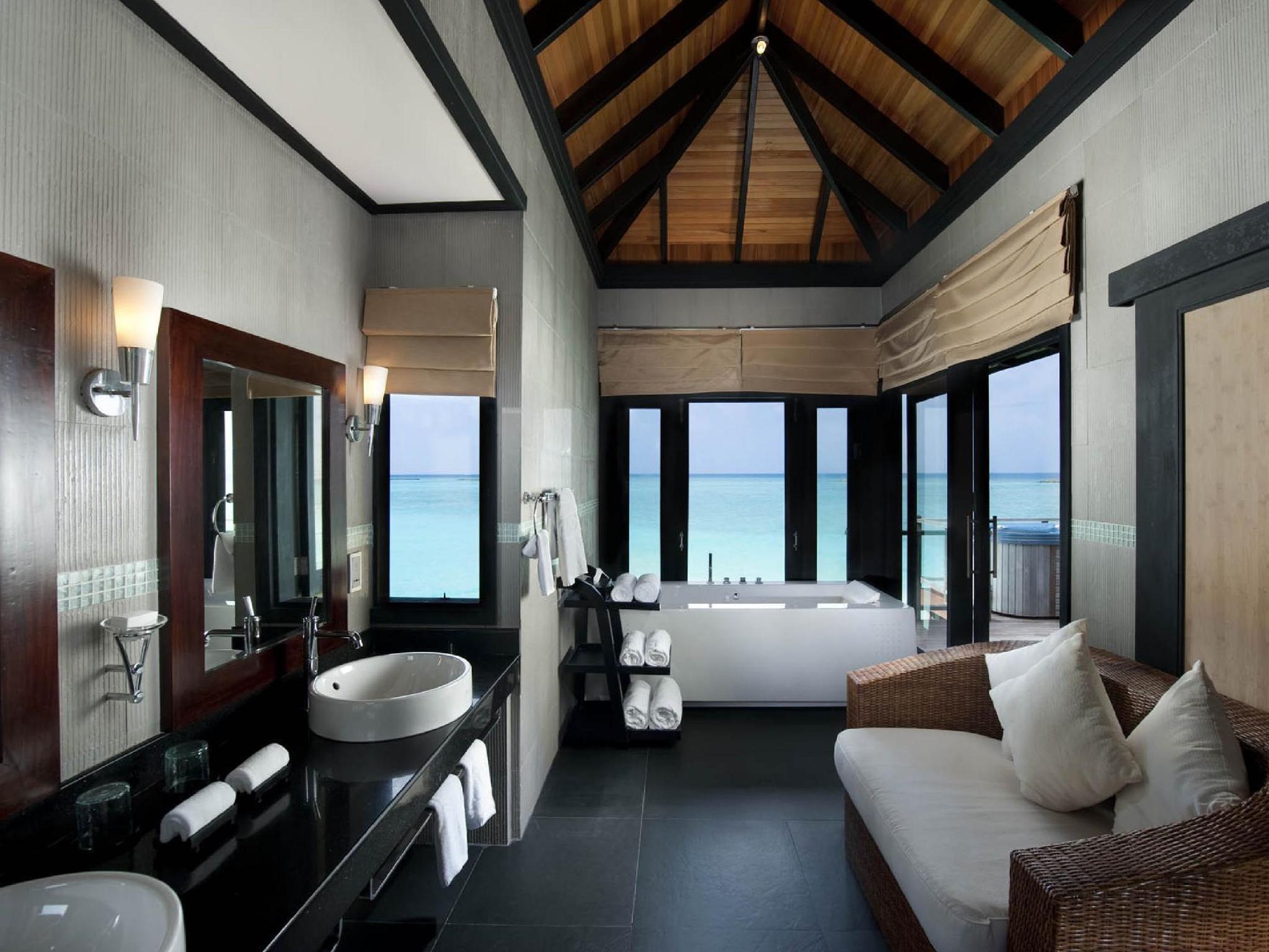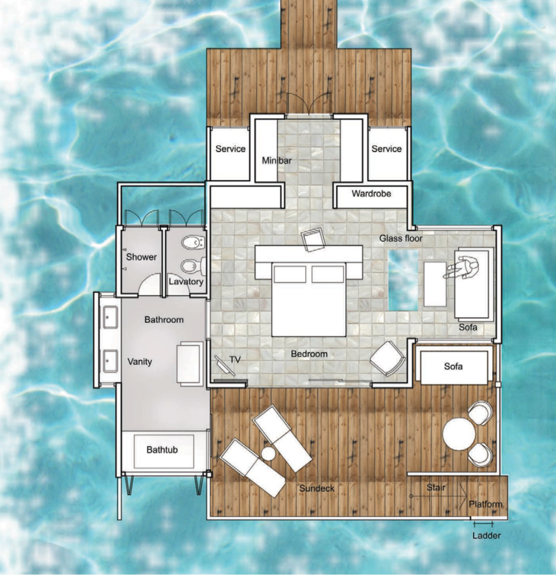 水上别墅从特大号床、休息区和宽敞的阳光甲板望去,优雅的开放式客厅和一块天然调色板完美融入了无边的海景。宽敞的浴室配备了双洗手盆和露天水上淋浴,水疗浴缸适合您一边悠闲地泡澡,一边欣赏令人着迷的海景。
