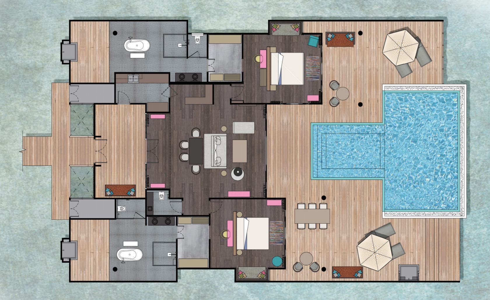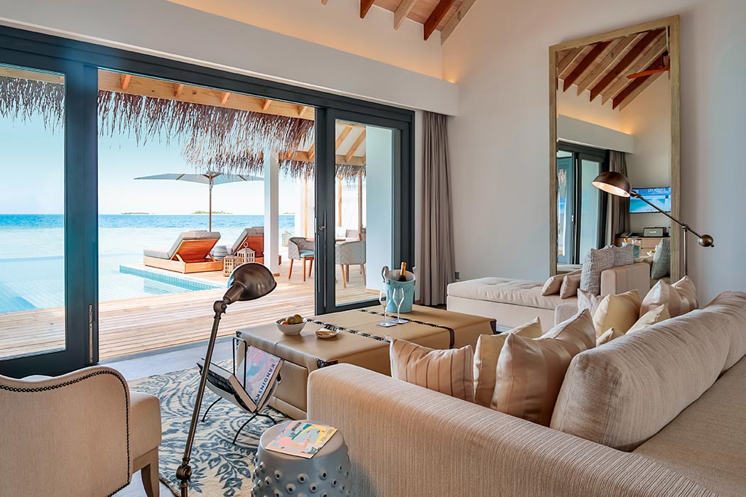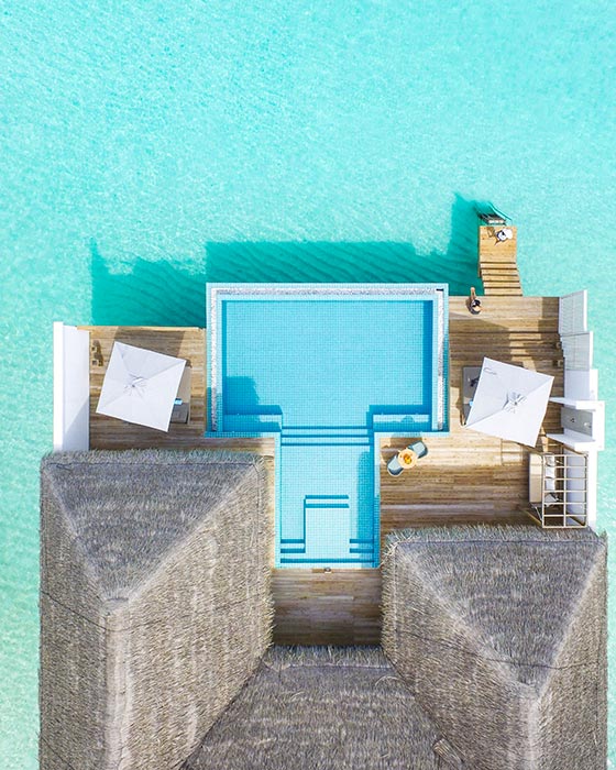 这些460平方米的别致水上别墅设有私人8米淡水游泳池和带日光躺椅的宽敞甲板,是你度过慵懒时光或娱乐的理想场所。