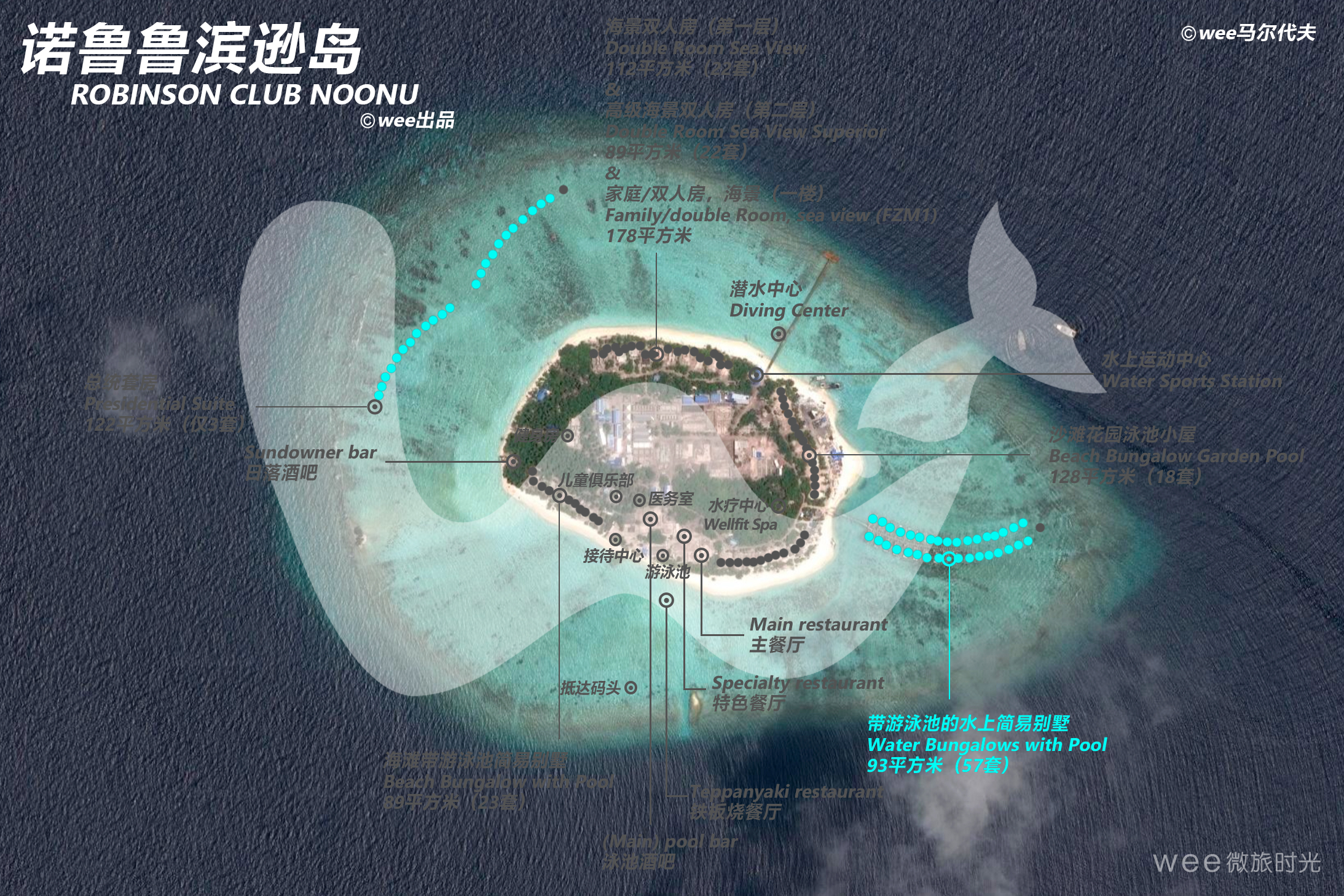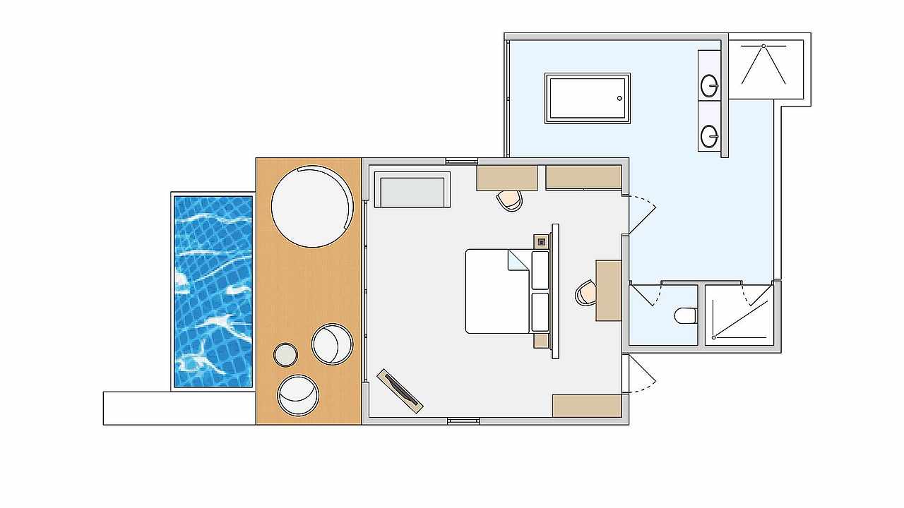 此户型面积为93平方米,位于泻湖(码头上),享有海景1间卧室,1间带浴缸,淋浴,卫生间和室外淋浴的浴室,带私人游泳池的露台,日光浴床和休息区。