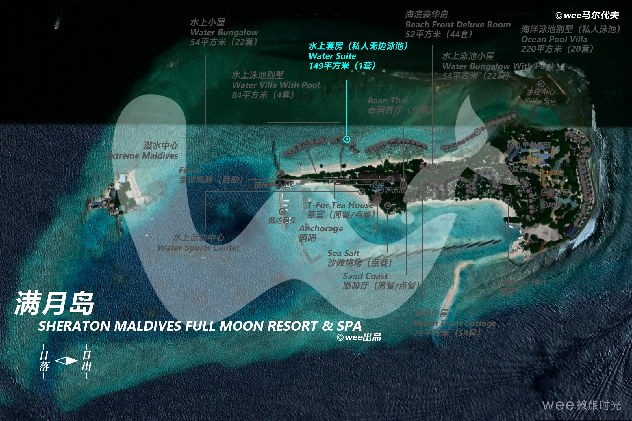 独有的水上套房设有带私人露台的独立休闲区以及时尚家具,其中包括舒适的藤制座椅和玻璃面桌子。 舒适宜人的卧室可俯瞰第二露台区,并设有日光躺椅,可直通大海。 宽敞的浴室可直通两座露台,并设有一个舒适宜人的露天按摩池,是放松休闲、饱览变幻无穷的印度洋美景的绝佳之地。
