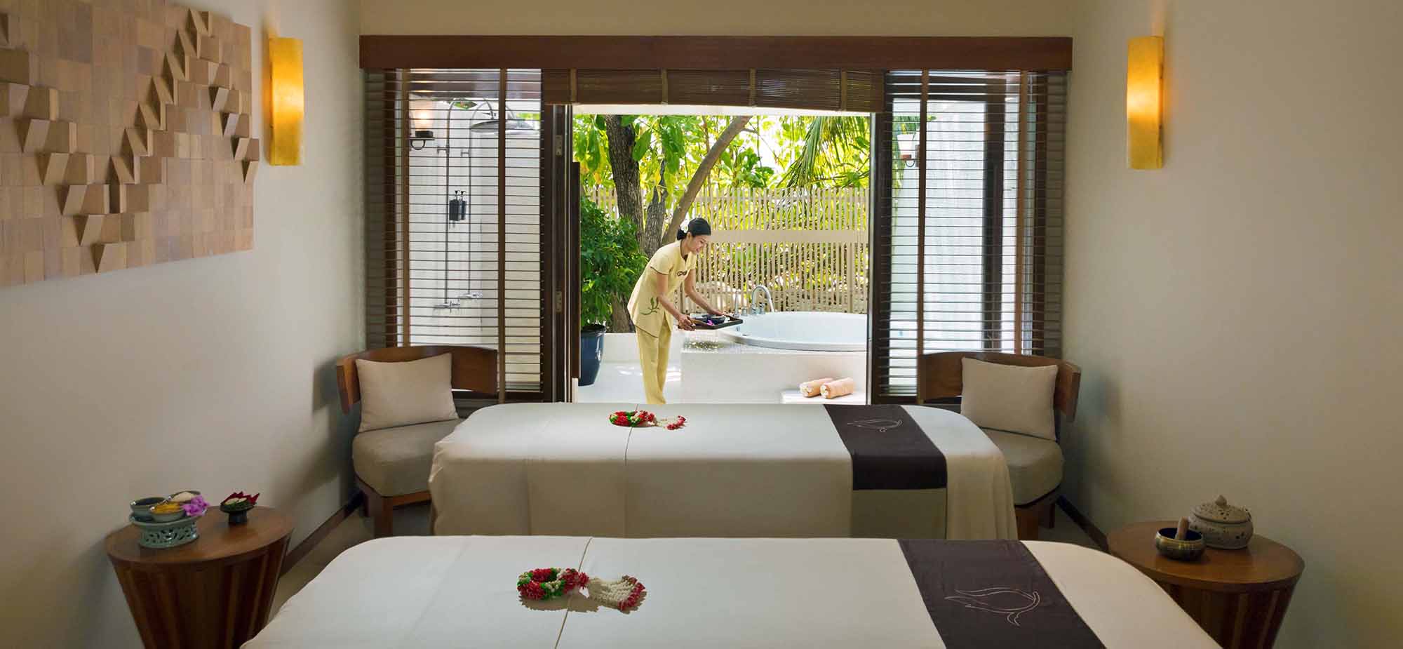 水疗中心有单人和情侣套房,带按摩浴缸的理疗室,一个专门提供泰式按摩的独特凉亭,一个眺望海滩和泻湖的精美休闲亭,非常适合早期瑜伽课程,还有美甲和修脚沙龙。