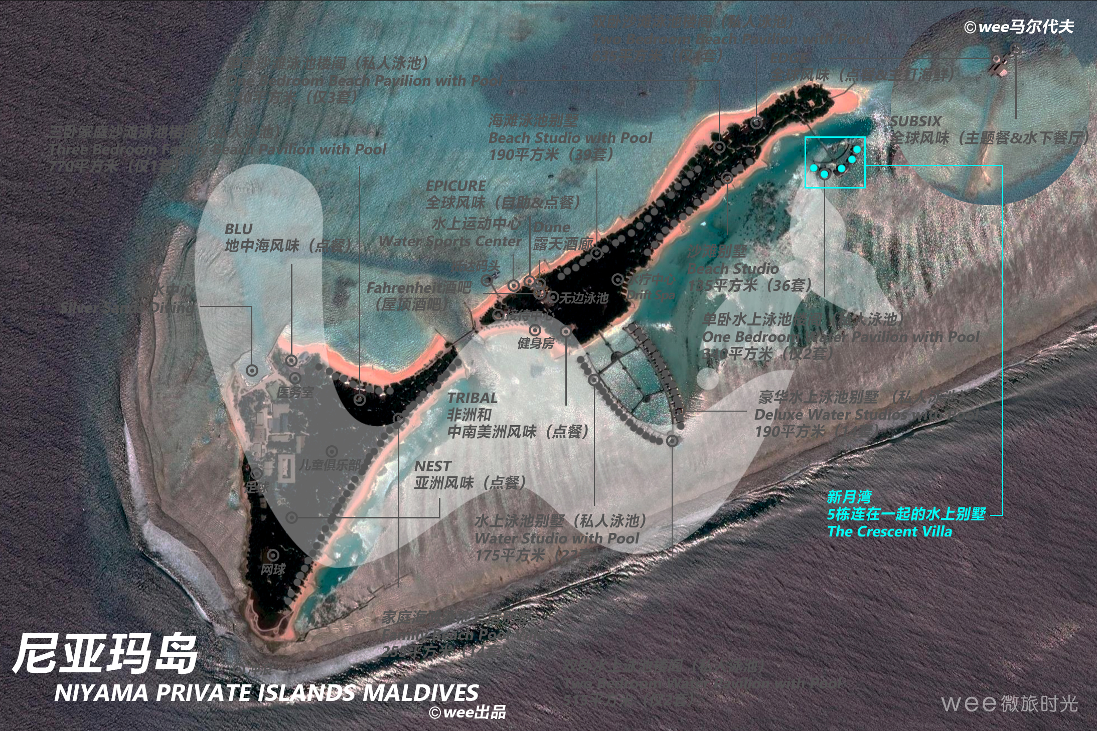 新月湾的中心是一栋两卧室海景泳池别墅,两侧分别是两栋一卧室水上别墅和两栋豪华水上小屋,所有五栋别墅皆拥有私人泳池。两名专属私人管家、一名私人大厨和一名保洁人员,确保你的海岛绿洲一切顺畅运转。