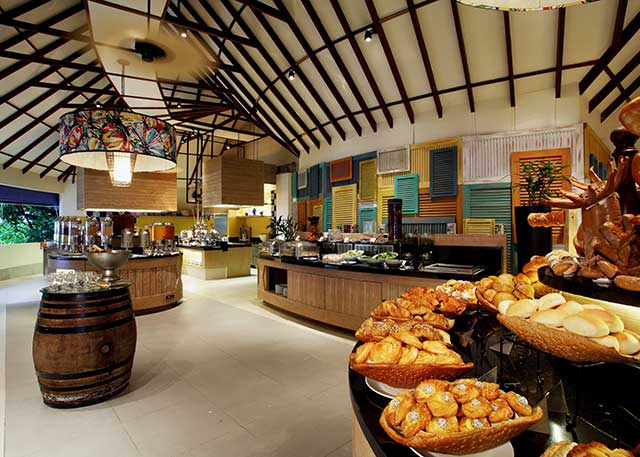 Reef毗邻游泳池,俯瞰着海滩,设有茅草屋顶,是一家经典的岛屿餐厅。这里是亚洲和西方美食的大熔炉,提供丰富多彩的自助餐以及素食餐饮选择,包括西方、亚洲风味的菜肴和日本铁板烧。驻唱乐队优美的歌声伴随整个用餐愉悦的进行。