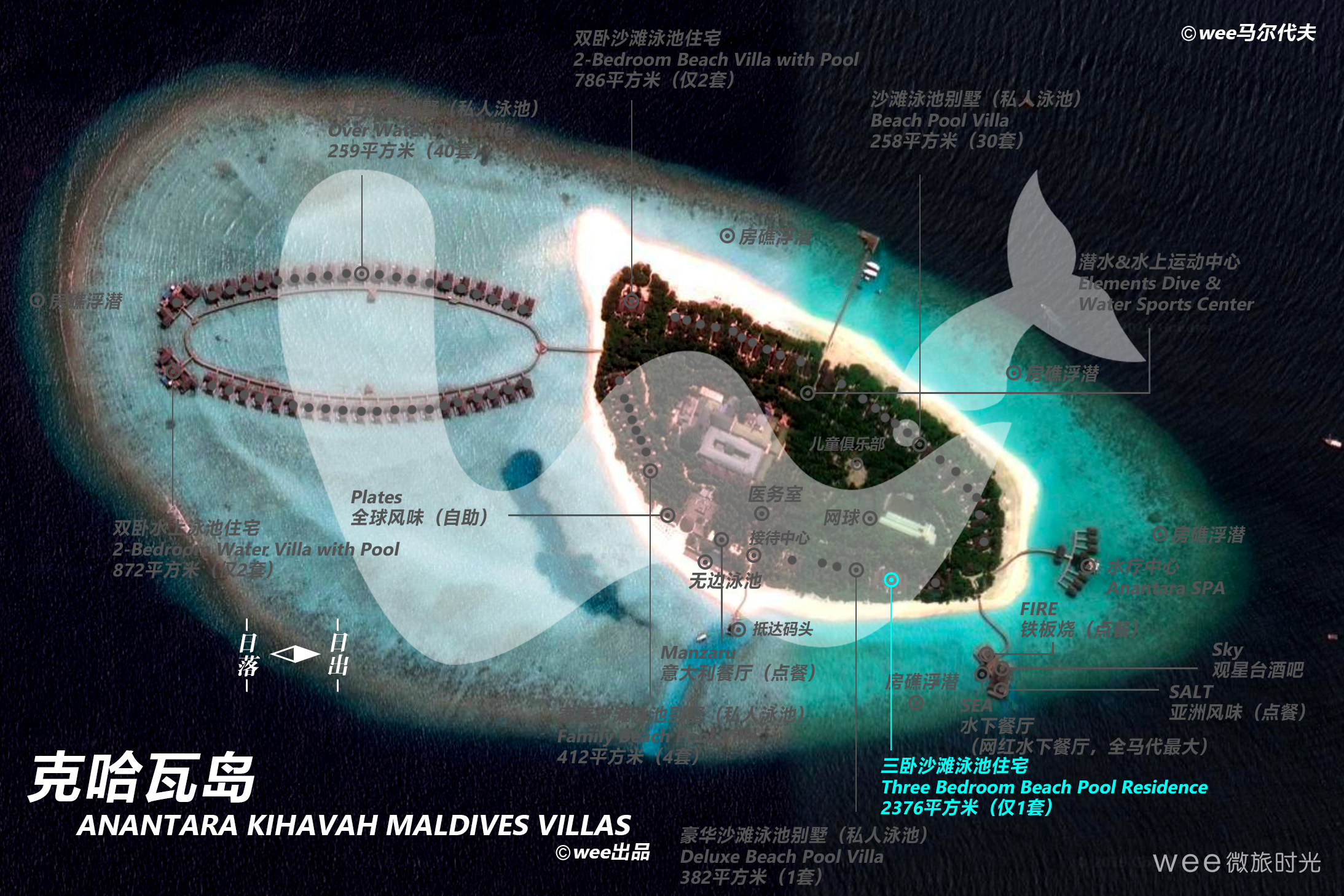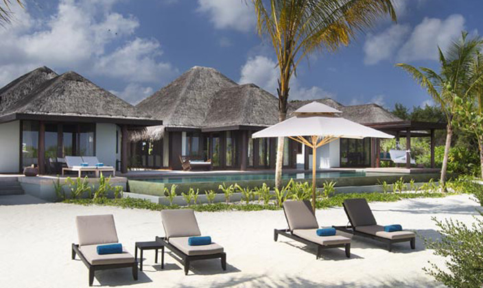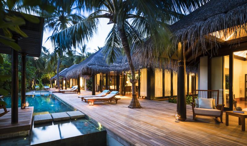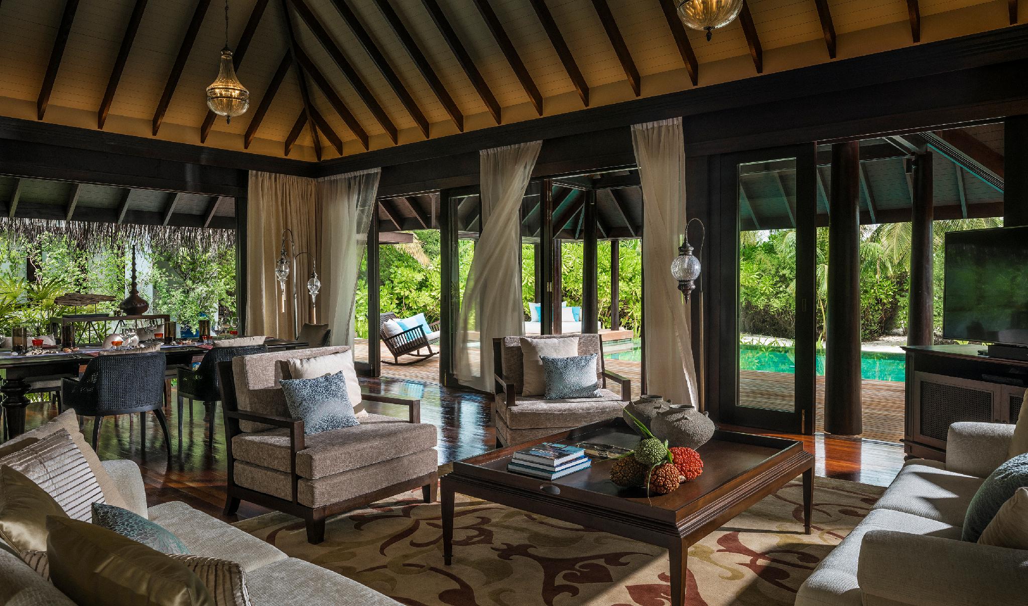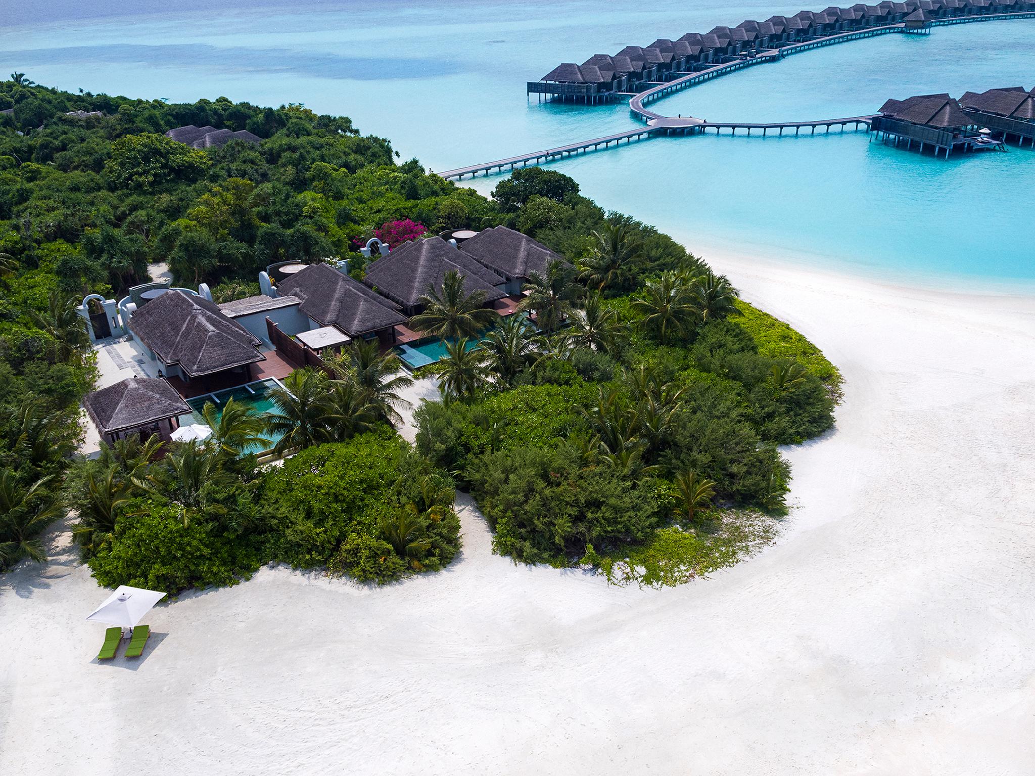 绝无仅有、宫殿般的静居,将终极海岛风格提升到一个全新境界。 沿着76米长的细软沙滩,2,736平方米的宽敞空间精心分隔。 主宅邸为一栋中央别墅,拥有客厅、餐厅和厨房,正对着宽敞的阳台、大型游泳池和按摩浴缸,以及用餐亭和一个BBQ台。 两个主卧室别墅与中央别墅分隔而立,都拥有半露天浴室,沉入式浴缸周围环绕着水塘、瀑布和户外雨林式花洒。 第二栋宅邸拥有第三个主卧室,拥有私家泳池和用餐亭、同样宽敞的浴室和一个私家入口。 每栋宅邸的客人共享大片的热带花园,以及按摩亭和设有水烟休息区的海滩小屋,私人管家随时服务。