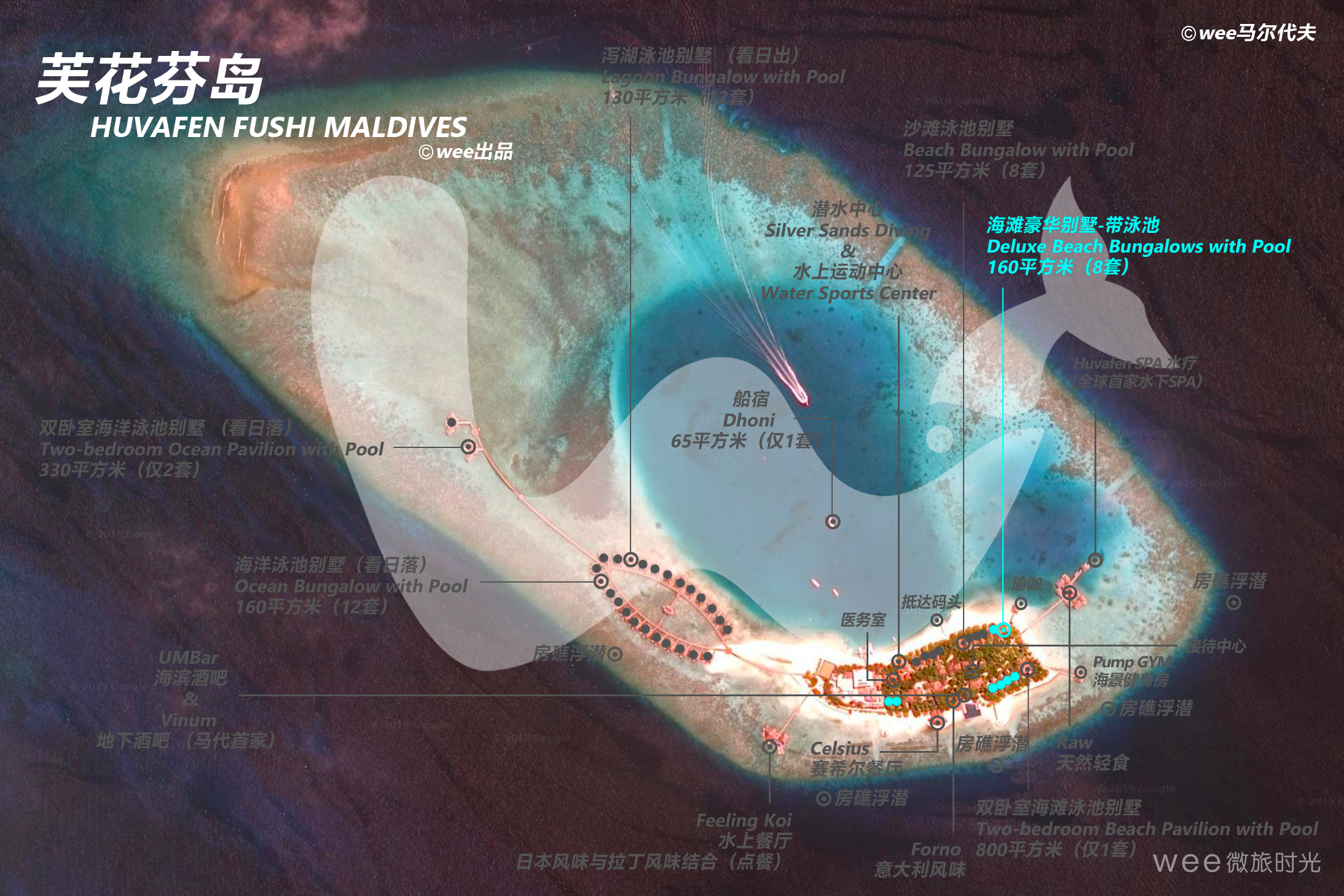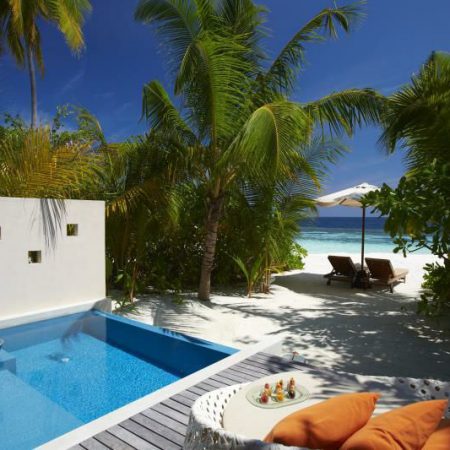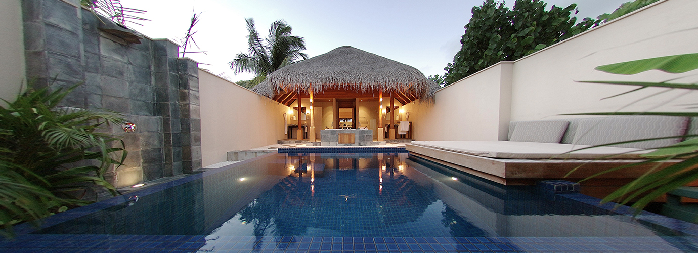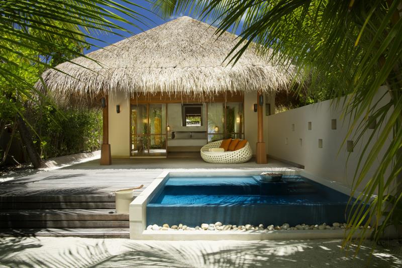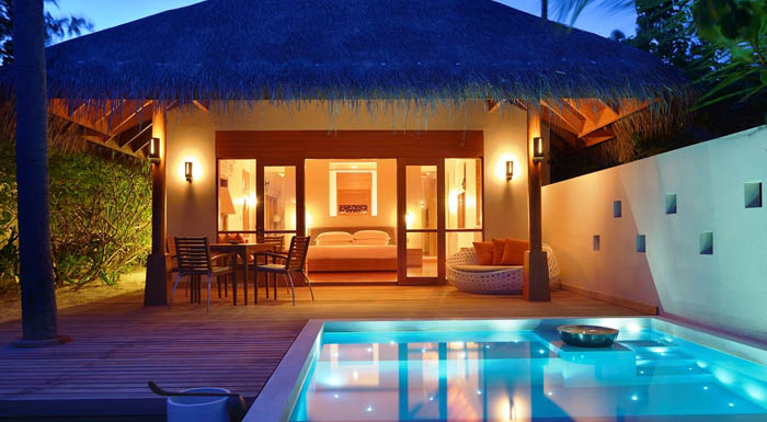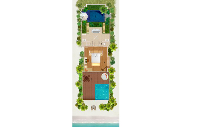 豪华海滩泳池别墅比一般的海滩泳池别墅面积更大,设施几乎一样,差别主要在前者室内外空间和游泳池更宽敞,配有坐卧两用沙发和日光浴躺椅。