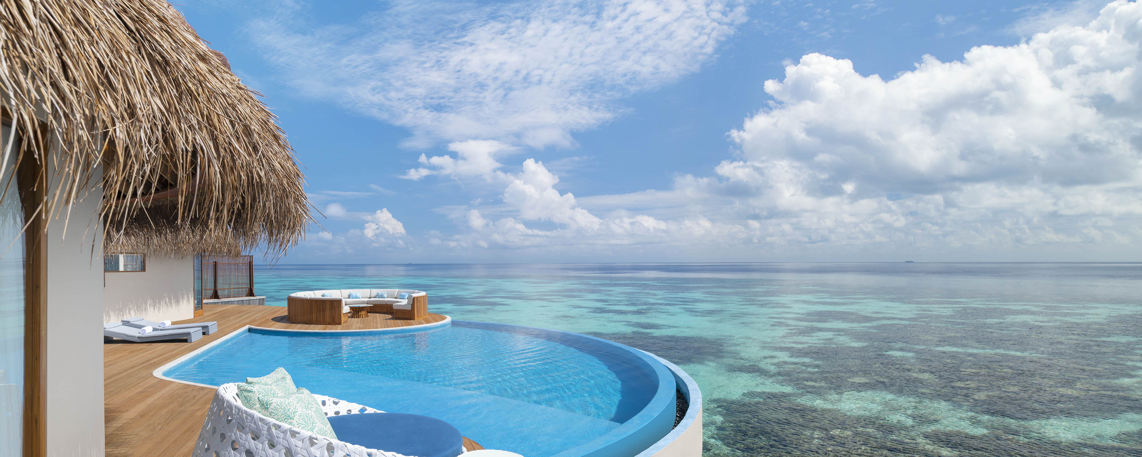 豪华Ocean Haven(海洋天堂)旨在终极之旅,在原始隐私中寻求独处,将放松或娱乐放在极致。室内/室外休息区有玻璃镶嵌的地板,露出下面的泻湖动物群,室外带有泡泡按摩浴缸座椅的超大无边泳池。