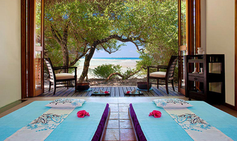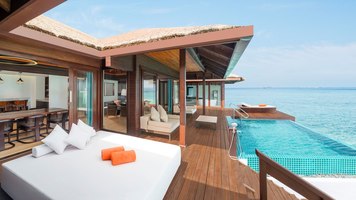 独有的仅一套水上套房设有带私人露台的独立休闲区以及时尚家具,其中包括舒适的藤制座椅和玻璃面桌子。 舒适宜人的卧室可俯瞰第二露台区,并设有日光躺椅,可直通大海。 宽敞的浴室可直通两座露台,并设有一个舒适宜人的露天按摩池,是放松休闲、饱览变幻无穷的印度洋美景的绝佳之地。