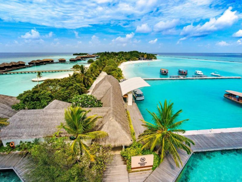 满月岛,英文全名(Sheraton Full Moon Island),岛上生长着众多品种的鲜花,姹紫嫣红、花香四溢。坐落于离马累机场6公里的地方,从机场码头乘坐20分钟的快艇即可到达。这座管状的狭长形岛礁拥有大片郁郁葱葱的椰林,迷人的海滩,美丽的海水,还有宽广的弧形沙滩。水上屋建在清澈的礁湖之上,海滩客房则隐藏在浓重的绿色包围之中。若你是以为细心的旅客,你很快会发现还有个像月牙形状的小岛安静地依偎于满月岛旁,就像一对相亲相爱的母子,显得温情十足,满月岛的名字也由此得来。
