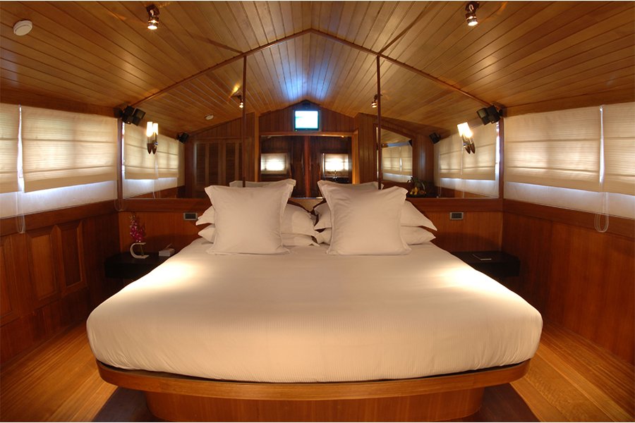 甲板下的生活空间,凉爽安静。船内配有一张特大号床,酒窖和一流的美食迷你吧,你可尽情享用。