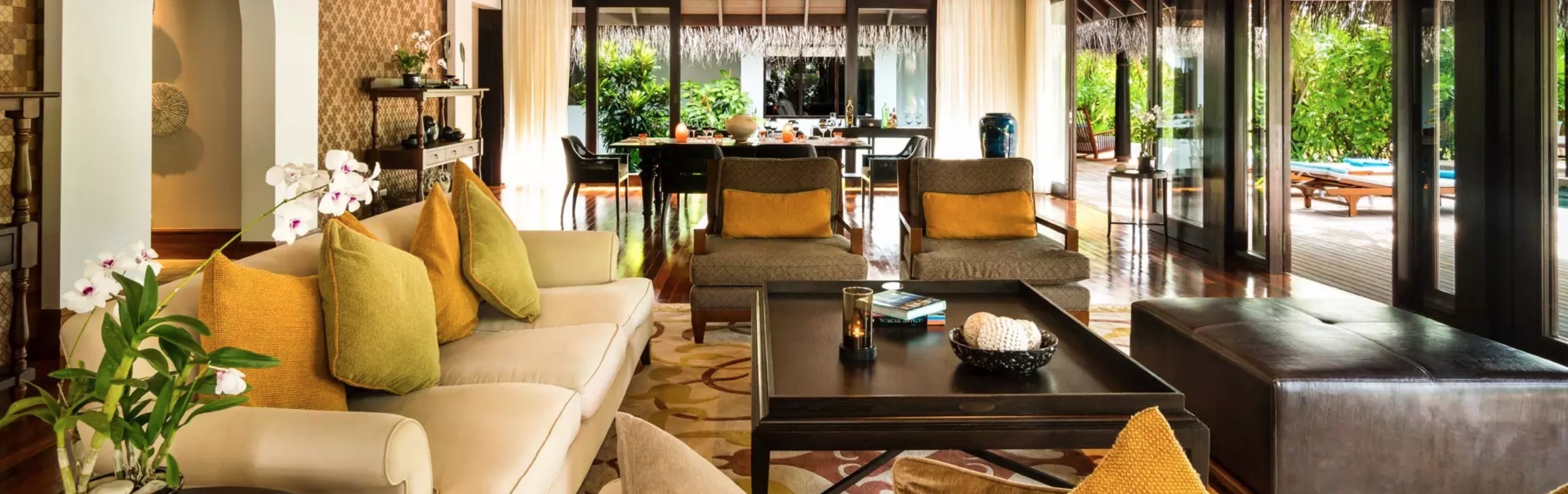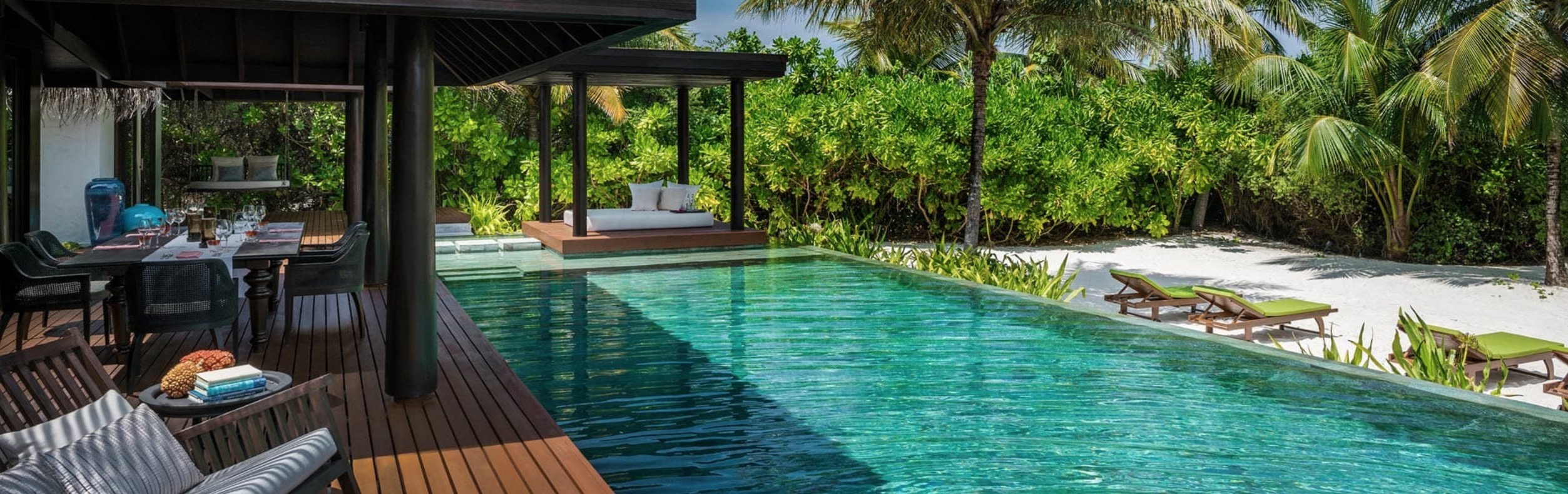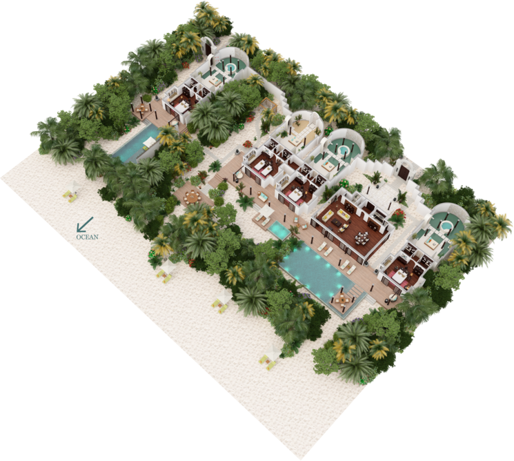 岛上最大的宅邸,将三卧室海滩泳池宅邸与相邻的海滩泳池别墅连通起来,拥有自己宽敞的泳池和日光甲板。适合大家庭或多达12人的好友一起入住,共享葱郁凉爽的空间和最高级的舒适,以及别墅管家的贴心服务。