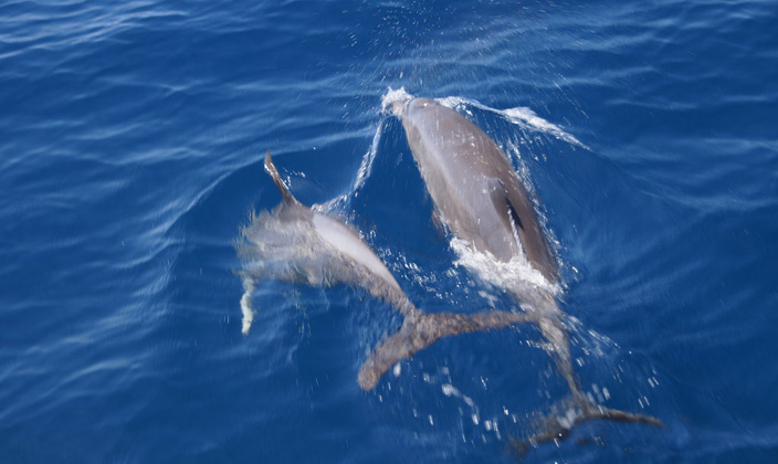 在马尔代夫,岛屿周围有数百只海豚。发现海豚的最佳时间是在日落之前,如果幸运的话可以看到真正有趣的海豚表演。