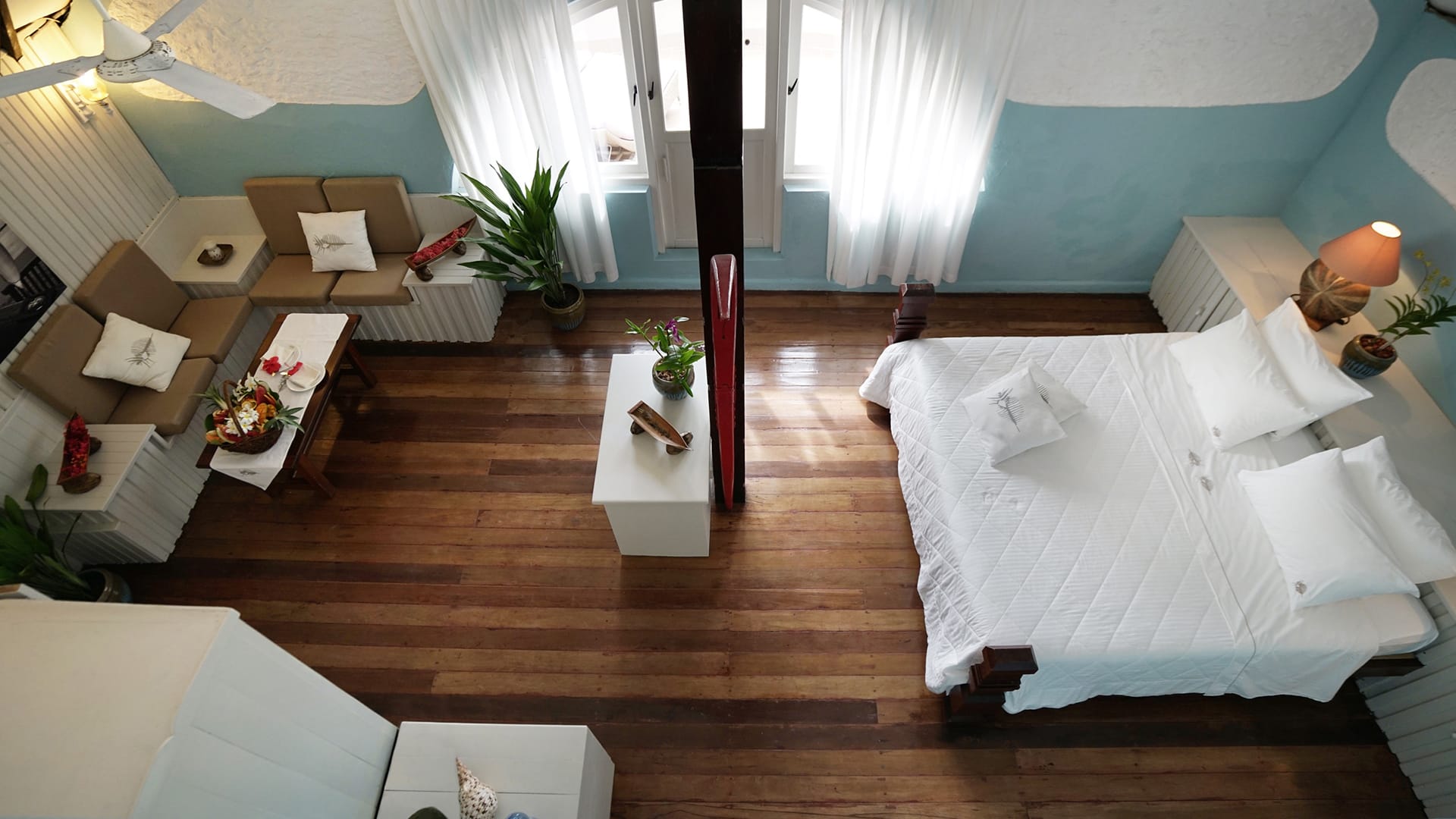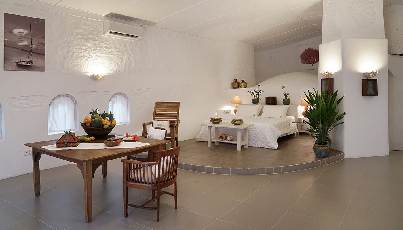 家庭海滩别墅设有一间带四柱床的双人间,一间大客厅,一间带室外马尔代夫淋浴的浴室以及一间带私人浴室和衣柜的第二双人间。