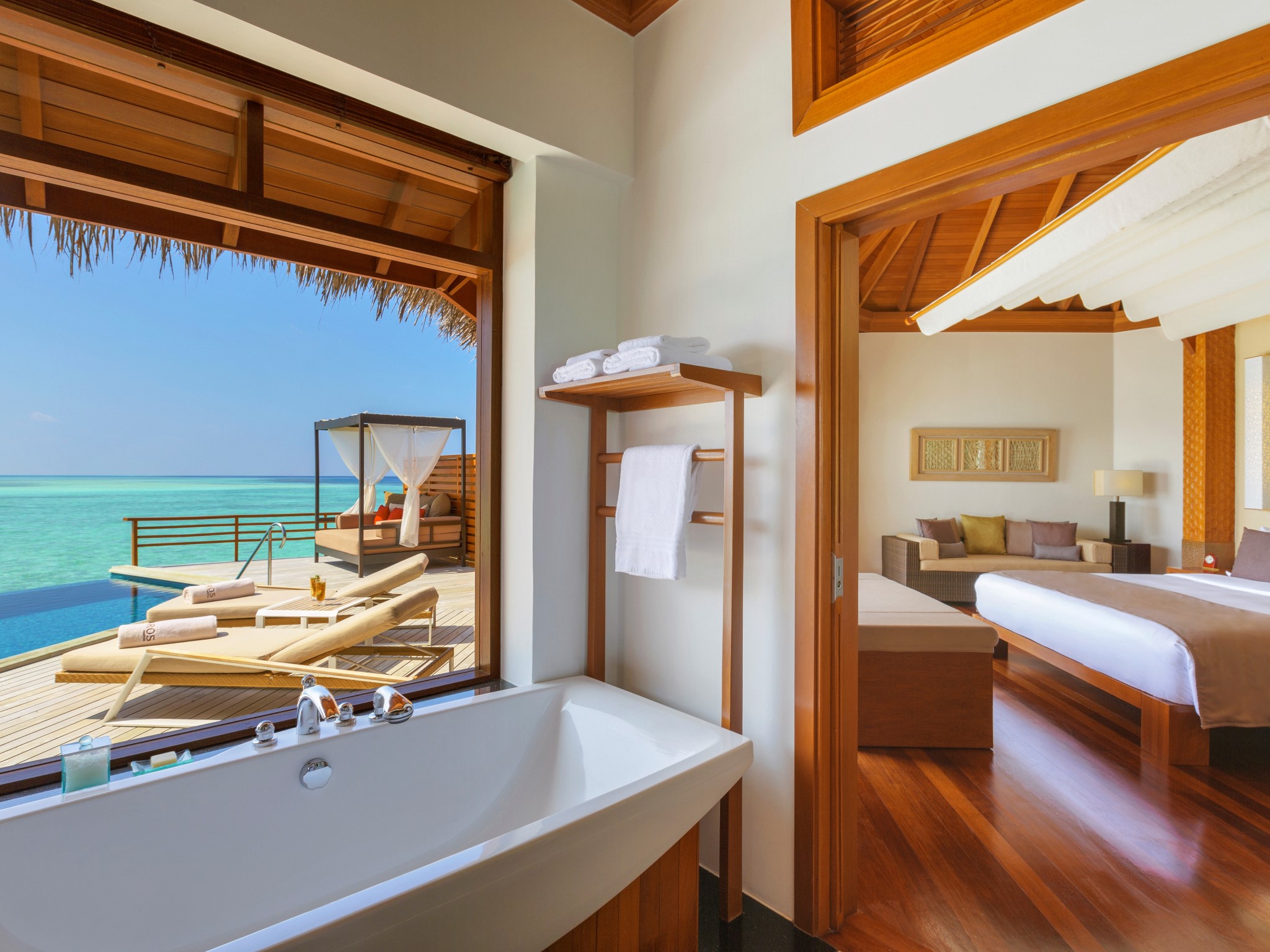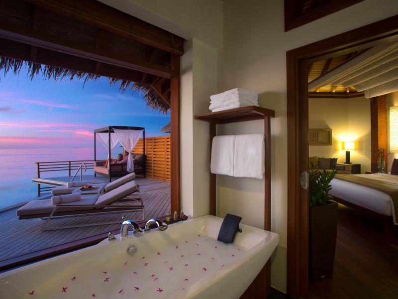 水上泳池别墅位于浮桥水末端,上屋建造在礁湖之上,海洋景致的壮阔一览无遗。舒适的家具和豪华床上用品,图书室和室内游戏,以及各种现代化的便利设施。水上屋的建材完全取用原木、和椰子茅草屋顶搭建,宽敞的阳台甲板,有绝对的隐私,可佣懒的躺着,让时光静止。你可以从甲板的木梯直接进入海水中,享受清凉的海浴。