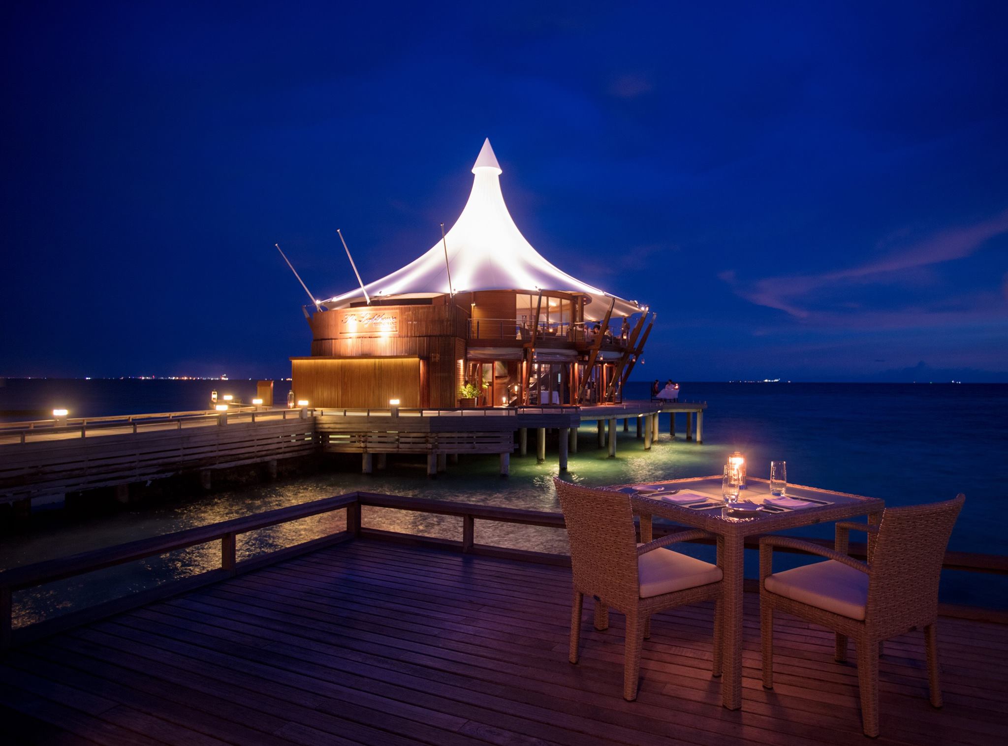 岛上一共有3个餐厅和2个酒吧,其中最负盛名的就是“ The Lighthouse Restaurant 灯塔餐厅 ”。灯塔餐厅是巴洛斯岛的标志,结合了亚洲与地中海的摩登时尚的建筑风格,楼上还有Multi-tiered,藏有各种葡萄酒,宛如一个丰富的酒窖。