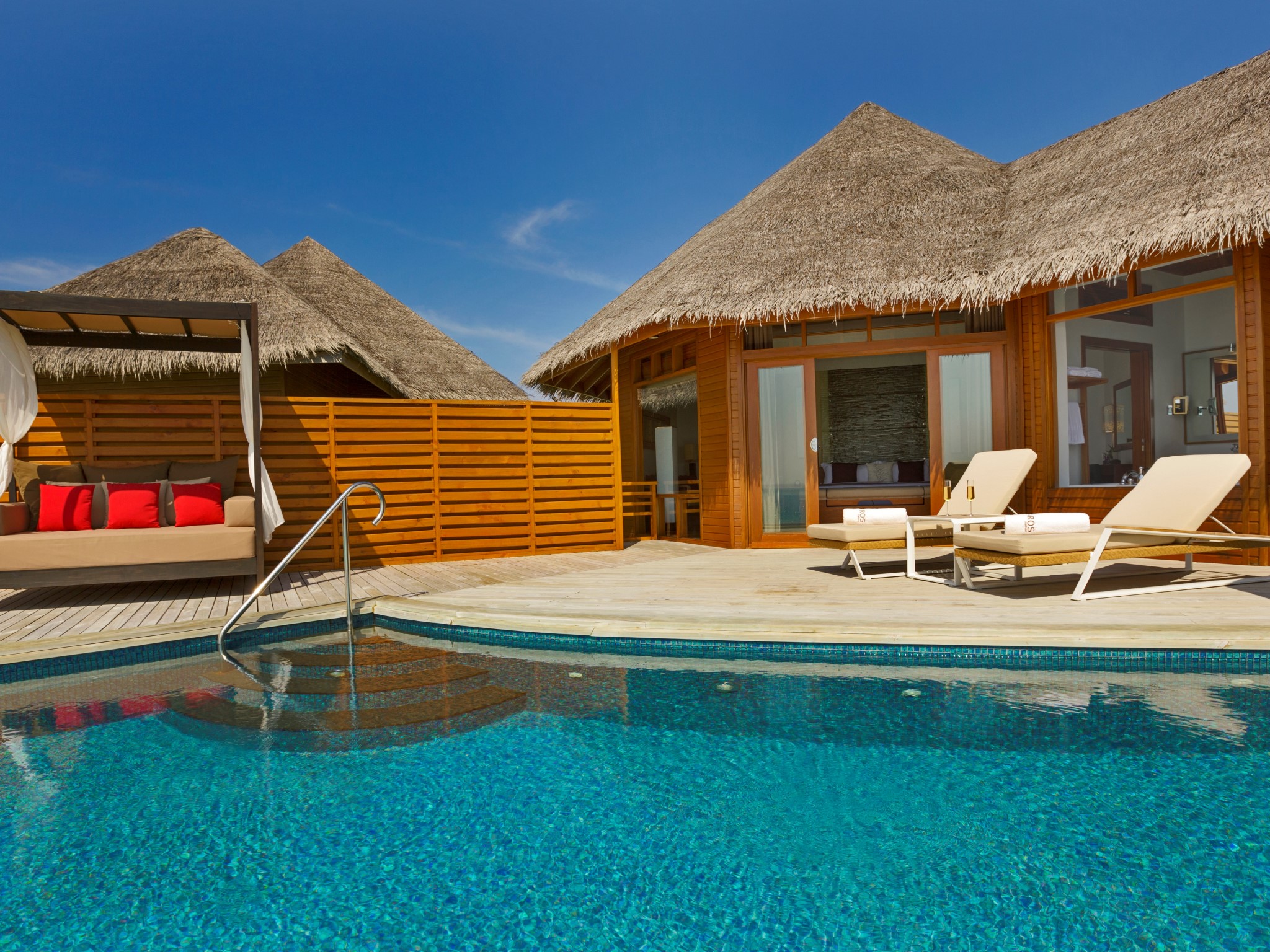 Baros酒店一共有75间房型,沙屋45间,水屋30间。沙屋的私密性非常好,几乎每个房型都有自己的一片小沙滩。水屋位于泻湖之上,可直接下海浮潜。