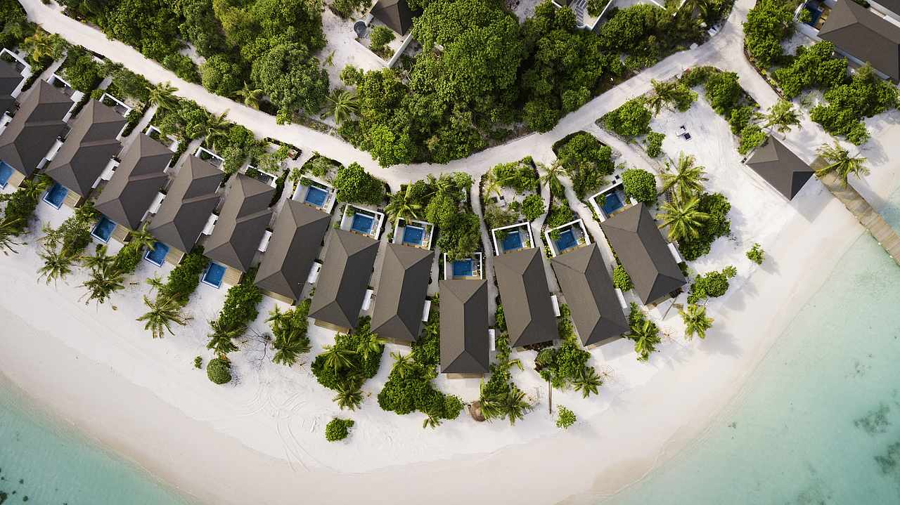 岛上一共拥有150间房,有7种房型,沙屋和水屋均有带泳池的房间,还有家庭套房。其中11栋是两层别墅,剩余的都是独立别墅。