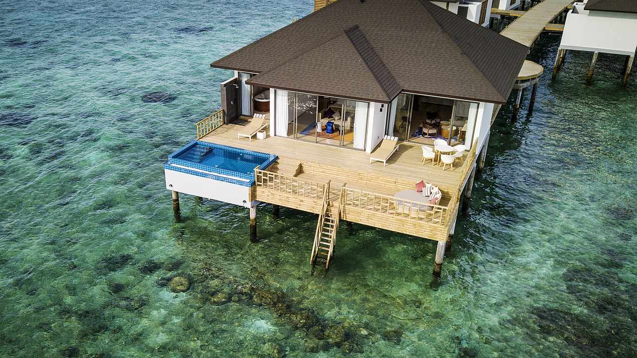 泳池水上屋建在码头的泻湖上,可欣赏海景。出于安全考虑,建议在9岁以上的儿童居住在泻湖的水上小屋。在最大入住容纳人数内,可提供婴儿床,预定时需说明。