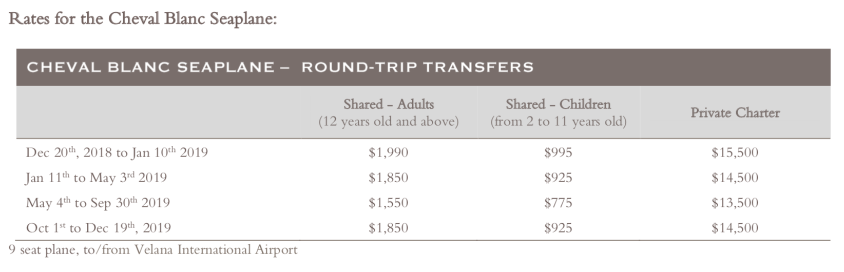 · 每个人只有一架Cheval Blanc水上飞机。这架水上飞机的可用性取决于几个因素,即预防性维护、先到先服务、第三方最后一分钟的私人包机或任何其他不可预见的情况,包括天气条件。如果vip水上飞机在您到达和/或离开时不可用,则将在其位置安排替代水上飞机转移,如下所述: