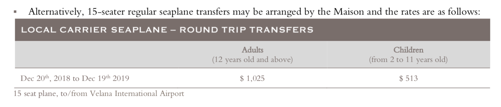 · 如果在常规水上飞机上单独预订座位,飞机必须与附近度假胜地的客人共享,并且在到达岛之前可能多次停留。出发时间由当地公司确定,可能会延迟。