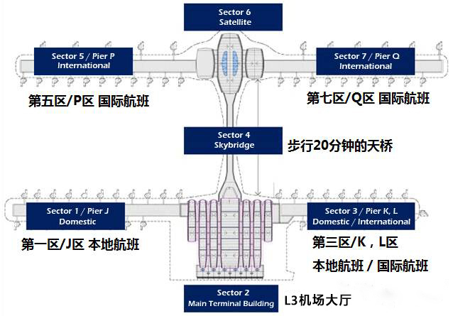 KLIA2的一层为地面交通中心、二层为到达大厅、三层为出发大厅