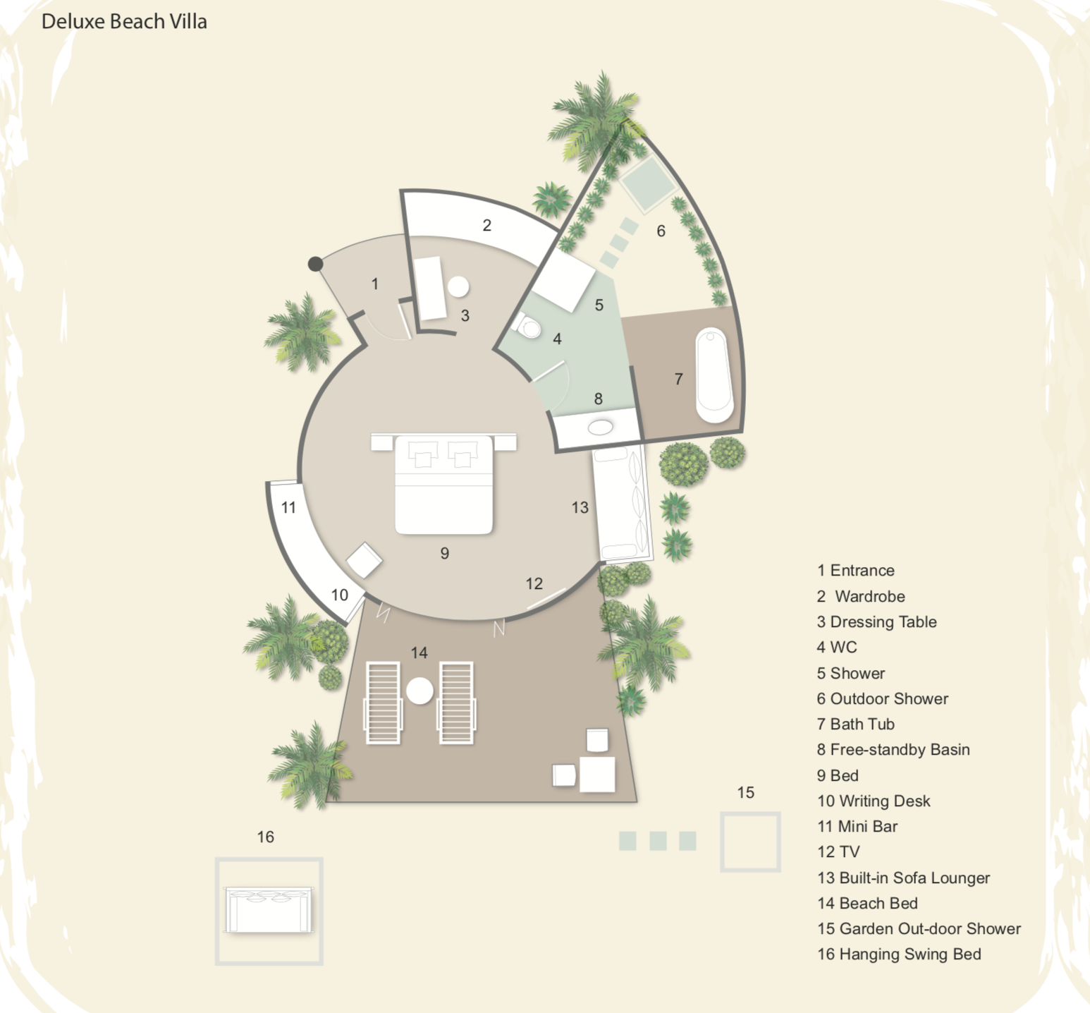 豪华海滩别墅坐落在郁郁葱葱的植被之中,每个别墅拥有全景海景,可以俯瞰如画海滩和泻湖的风景。全白色的室内装饰上了柔软的热带色彩主题,还有豪华的私人阳光甲板,舒适的浴室和美丽的海滩景色。