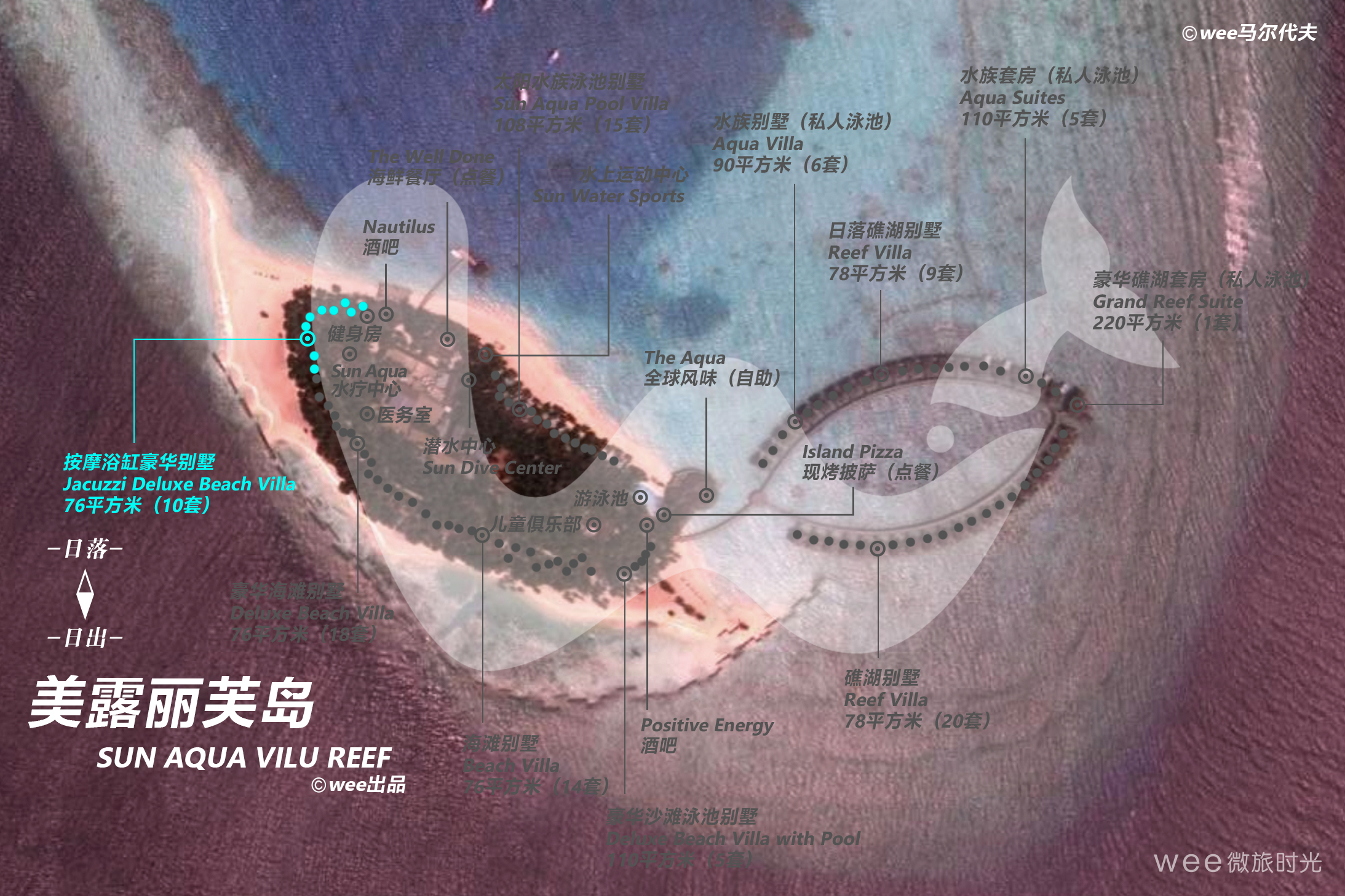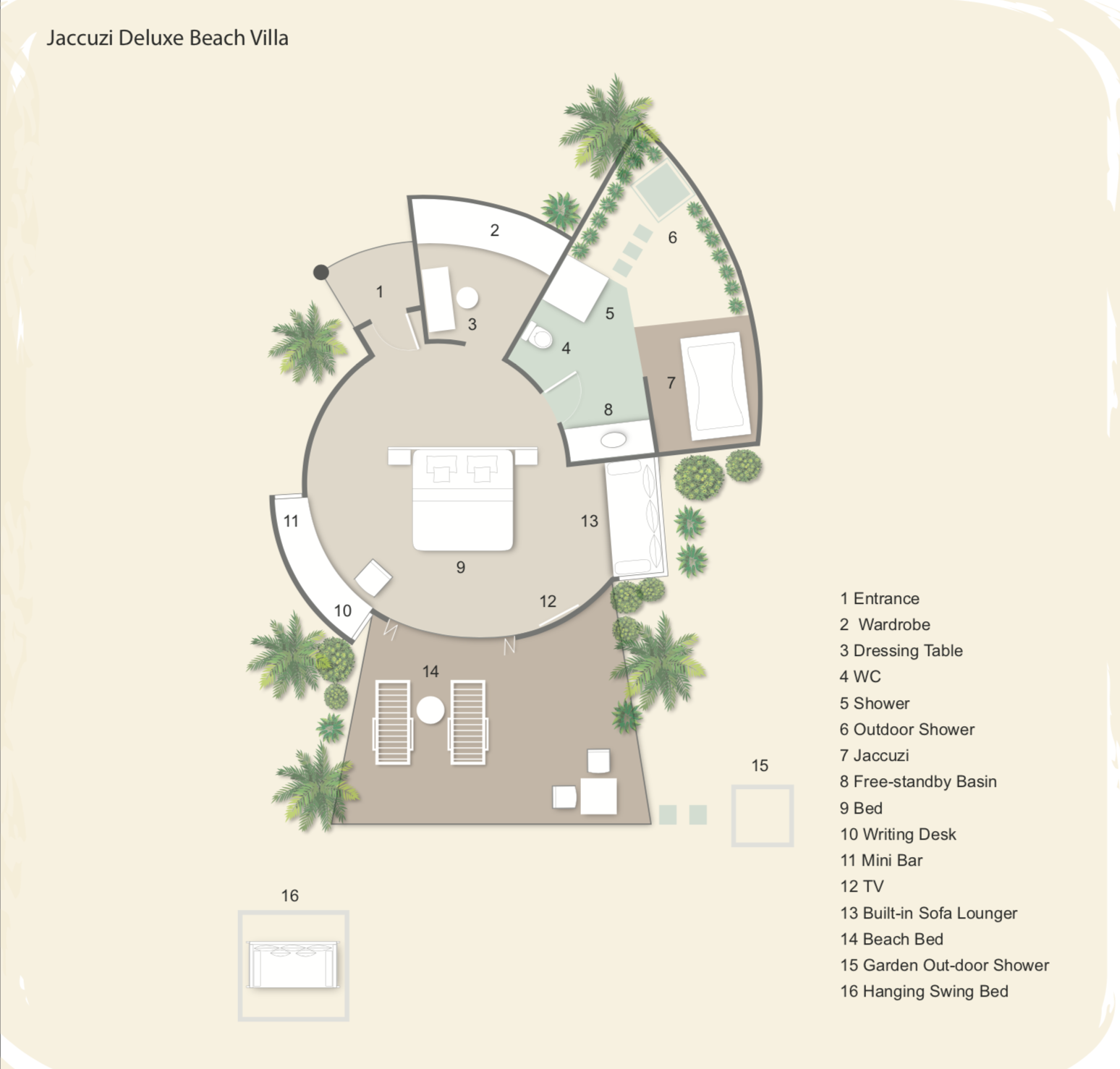 按摩浴缸豪华沙滩别墅是美露丽芙岛为数不多的房型,与豪华沙滩别墅比起来可以说是几乎一样,只是多配置了一个按摩浴缸。整个风格主要以浅色系为主,柔软的白色配搭上橙色的布料,更为别墅增添了一些神秘感和浪漫氛围。别墅距离海滩仅有几步之遥,可以直接欣赏到绝佳的海景景致。