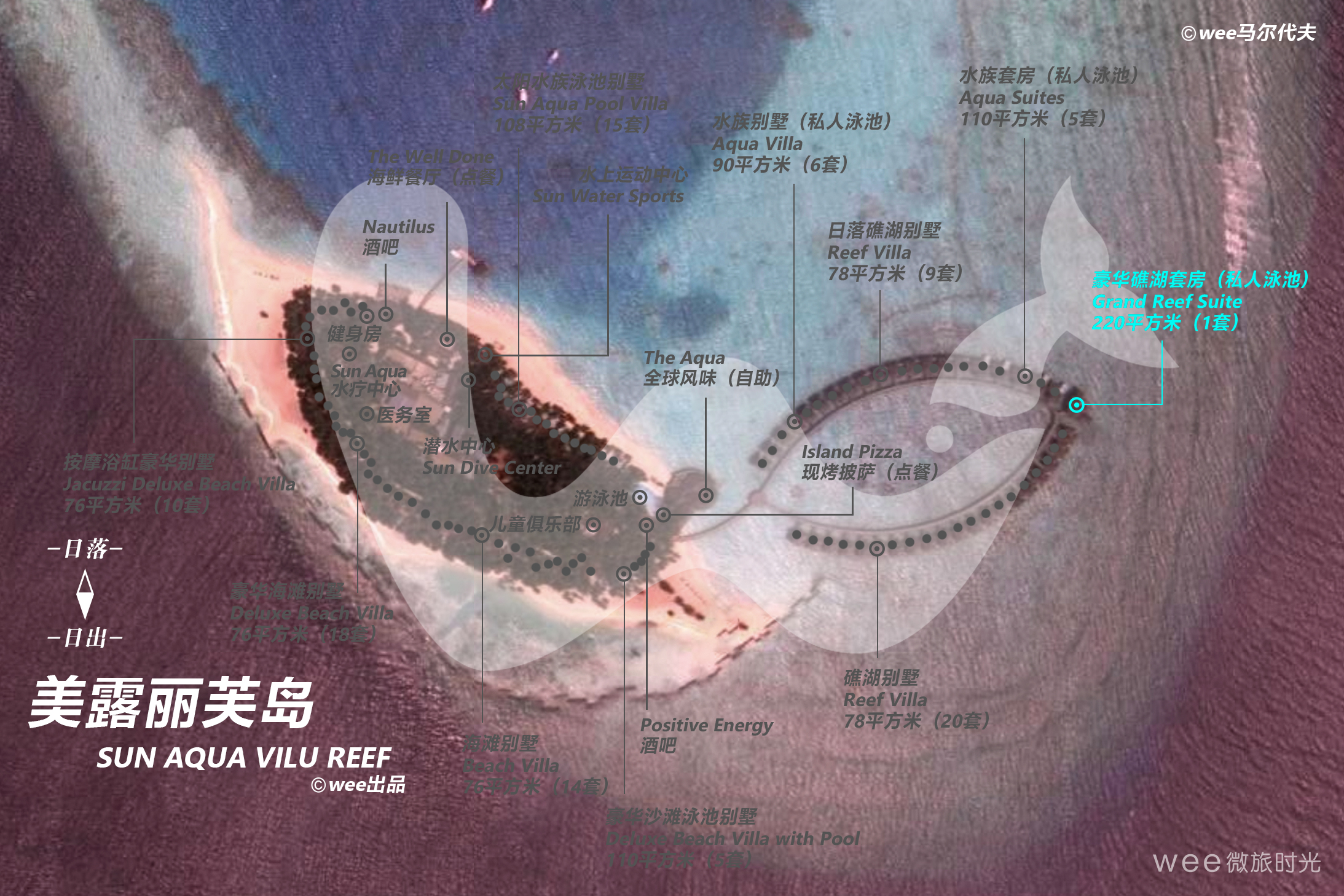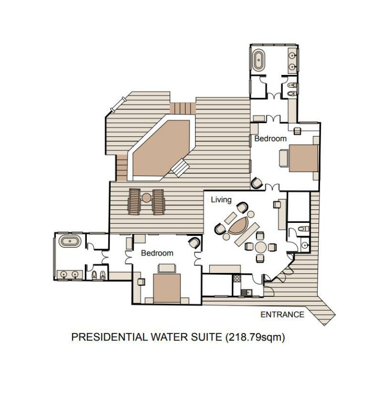 豪华礁湖套房是美露丽芙岛上唯一一间总统套房,拥有220平米的超大空间。位于所有水上别墅的最顶端,是欣赏海景的最佳地点,打造了一个梦幻般的度假天堂。室内设计结合欧式和马尔代夫传统风格的装饰,古典雅致中略带了一些南亚风格。屋里有两间特别大的卧室,分别都带独立的卫浴间。屋外面有超级大的甲板,并且有个大型私人游泳池。