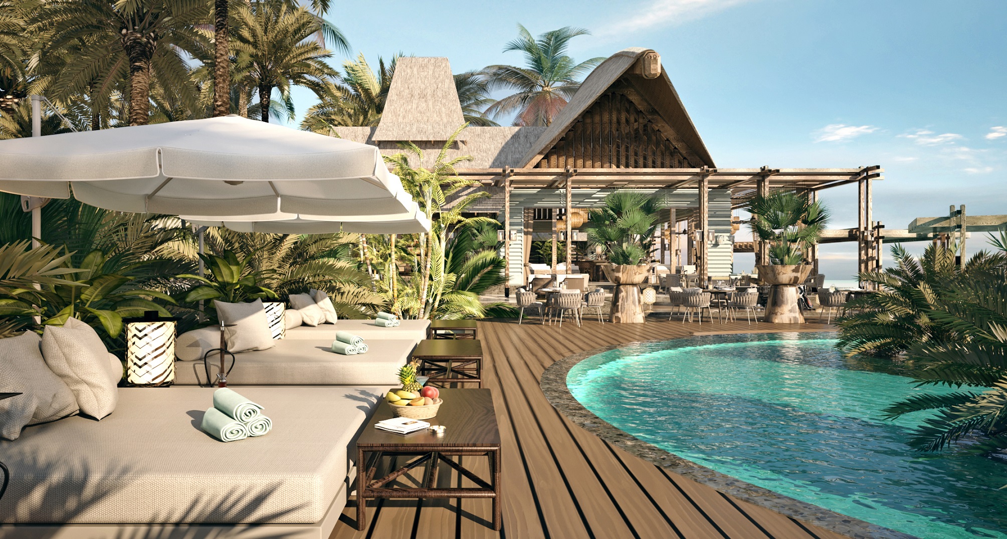 Mura Bar酒吧俯瞰着珍珠般的海滩和游泳池,与大海相映成趣,营造出无限闪亮的蓝色色调。小屋和凉棚提供足够的空间供每个人放松,餐厅提供美味的小吃,如街头食品等。有时还举办惊喜活动之夜,如日落仪式和现场表演。