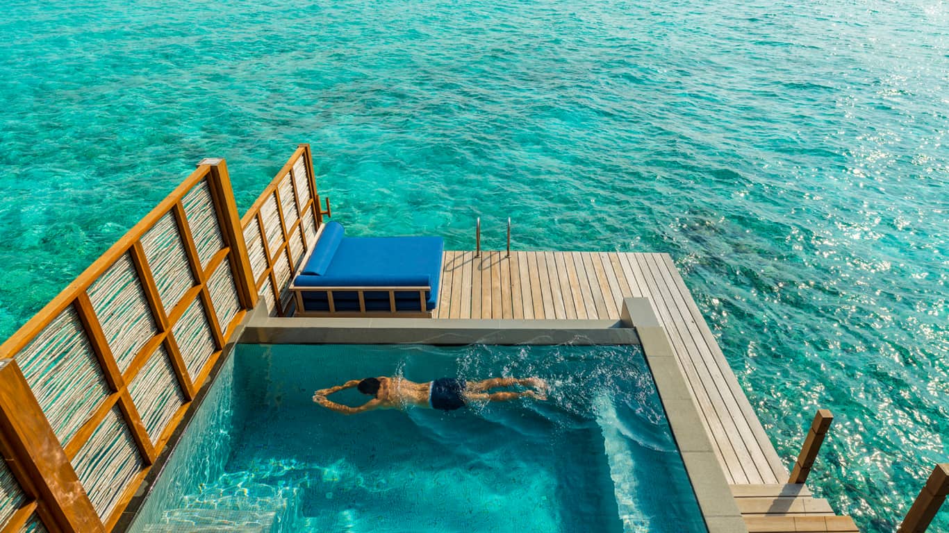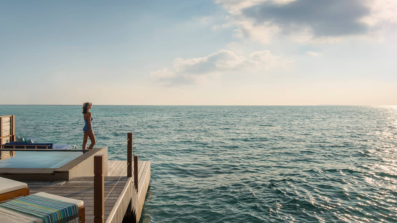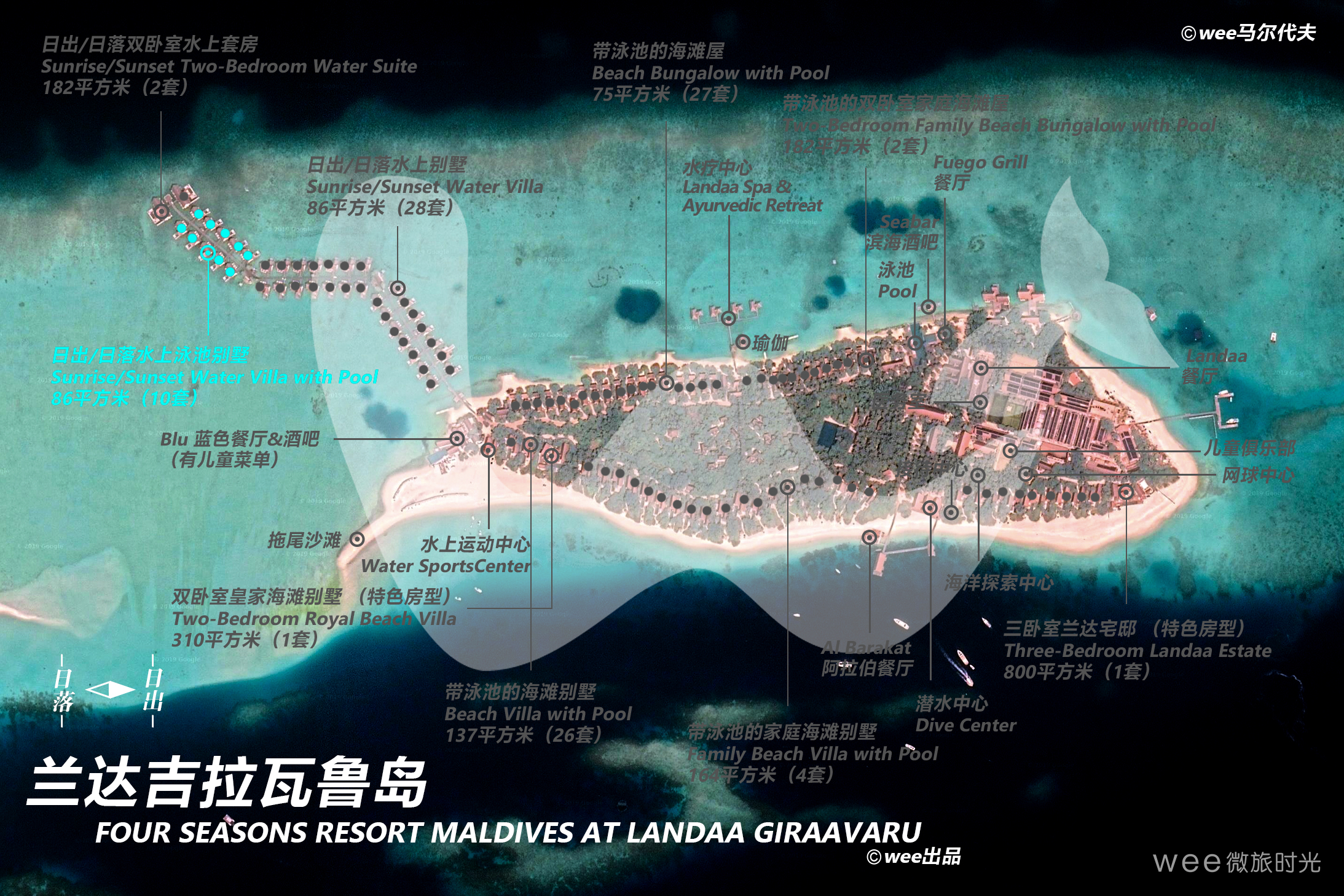马尔代夫兰达吉拉瓦鲁岛四季度假酒店的这些别墅位置绝佳,坐落于岛屿西北端的双层码头之上,可将美轮美奂的日出/日落景观尽收眼底。