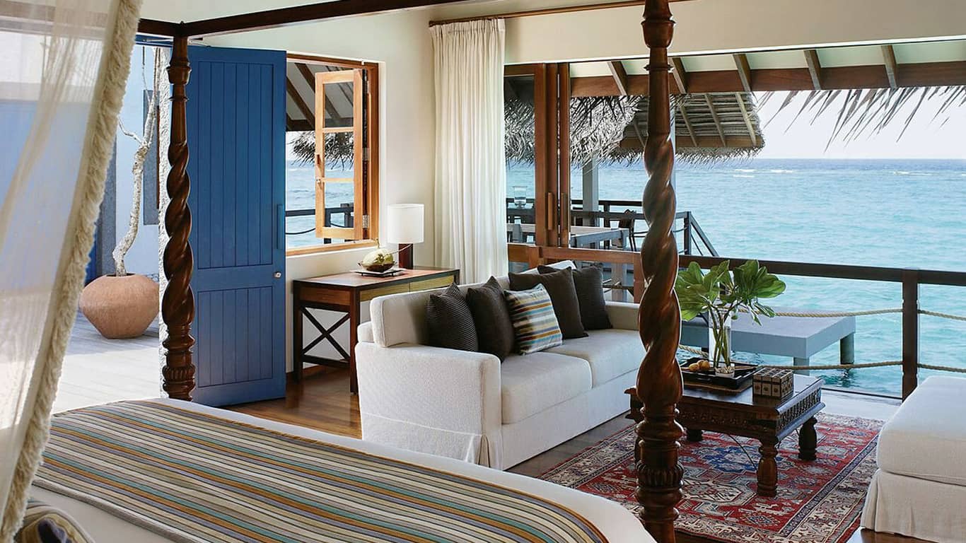 马尔代夫兰达吉拉瓦鲁岛四季度假酒店的三卧室海陆双景套房别具风情,它悬浮于宁静优雅的海面之上,你可在两个亭阁式卧室之中随心选择,度过美妙迷人的海上一夜。