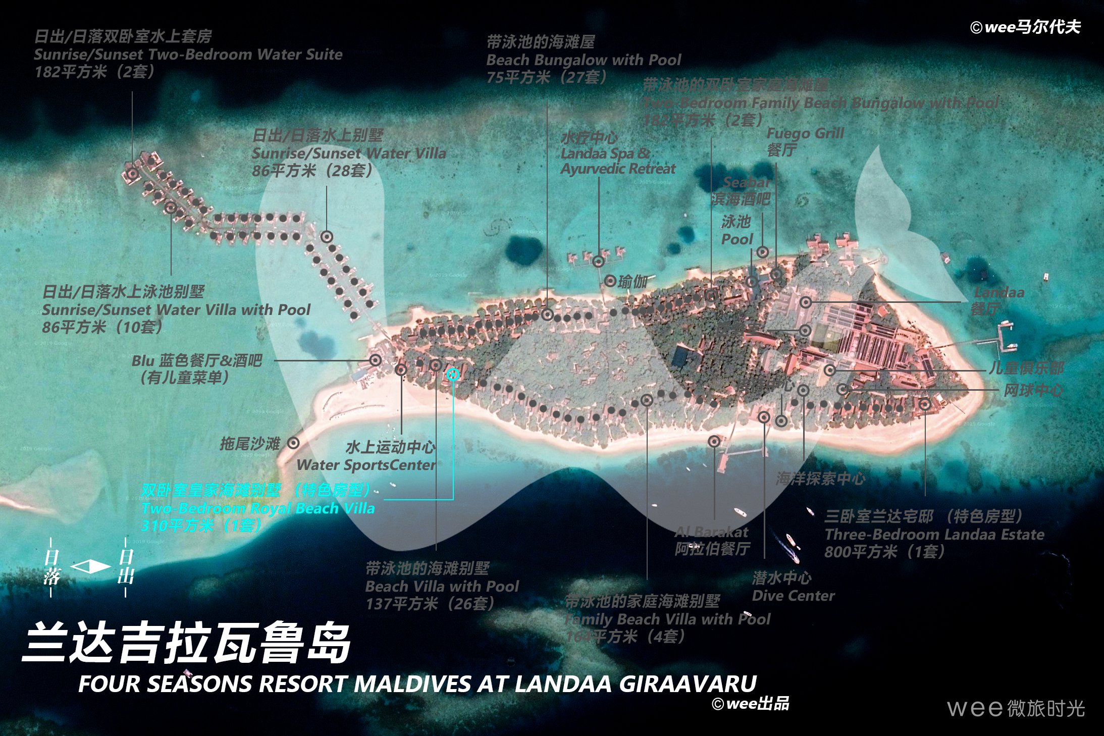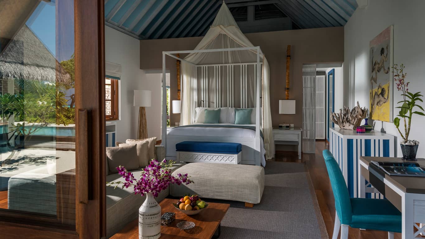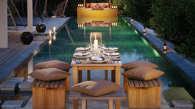 别墅的私人浅水泳池上建有“浮岛”餐厅,你可以在波光粼粼的水面享用美味。