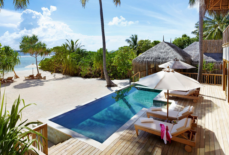配备私人游泳池的沙滩别墅隐藏在茂密的热带植被中,正对美丽的环礁湖,在宝蓝色大洋美景的环抱中享受绝对的私密空间吧。游泳池距离沙滩仅数米之遥,阳光躺椅就放置在游泳池边,畅游一番后可在此享受阳光的沐浴。伴随着柔和的海风拂动树叶的声音,在树林环绕的露天淋浴室或室外浴缸中美美地洗个澡,在私人花园中静静地放空自己。该别墅同样拥有悬空观景台。