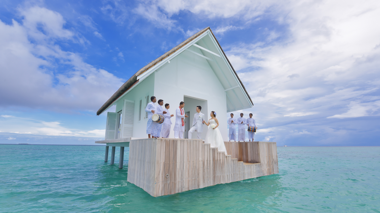 在透着闪烁波光的玻璃通道上,一步步走向你未来的幸福生活,海龟和彩虹鱼将成为这一重要时刻的见证。联合国教科文组织世界生物圈保护区的碧波环绕四周,无边无际,唯一登上这座婚礼凉亭的途径是搭乘船只——在这个华美的水上制高点举办完美的婚礼,永恒的自然美景将让你留下终生难忘的回忆。