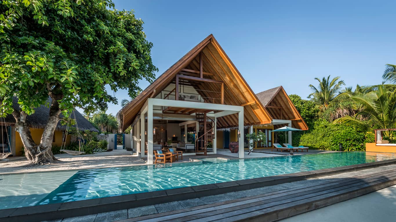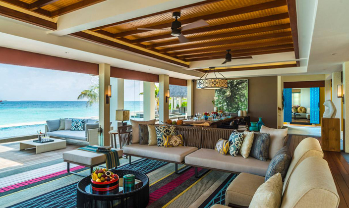 陆上与海洋别墅 中,地面上的起居区域和水上的卧室之间以巨大的泳池甲板相连。超豪华的 三卧室兰达宅邸 拥有属于自己的 80 米长海滩和足足 2,000 平方米的户外起居生活区。