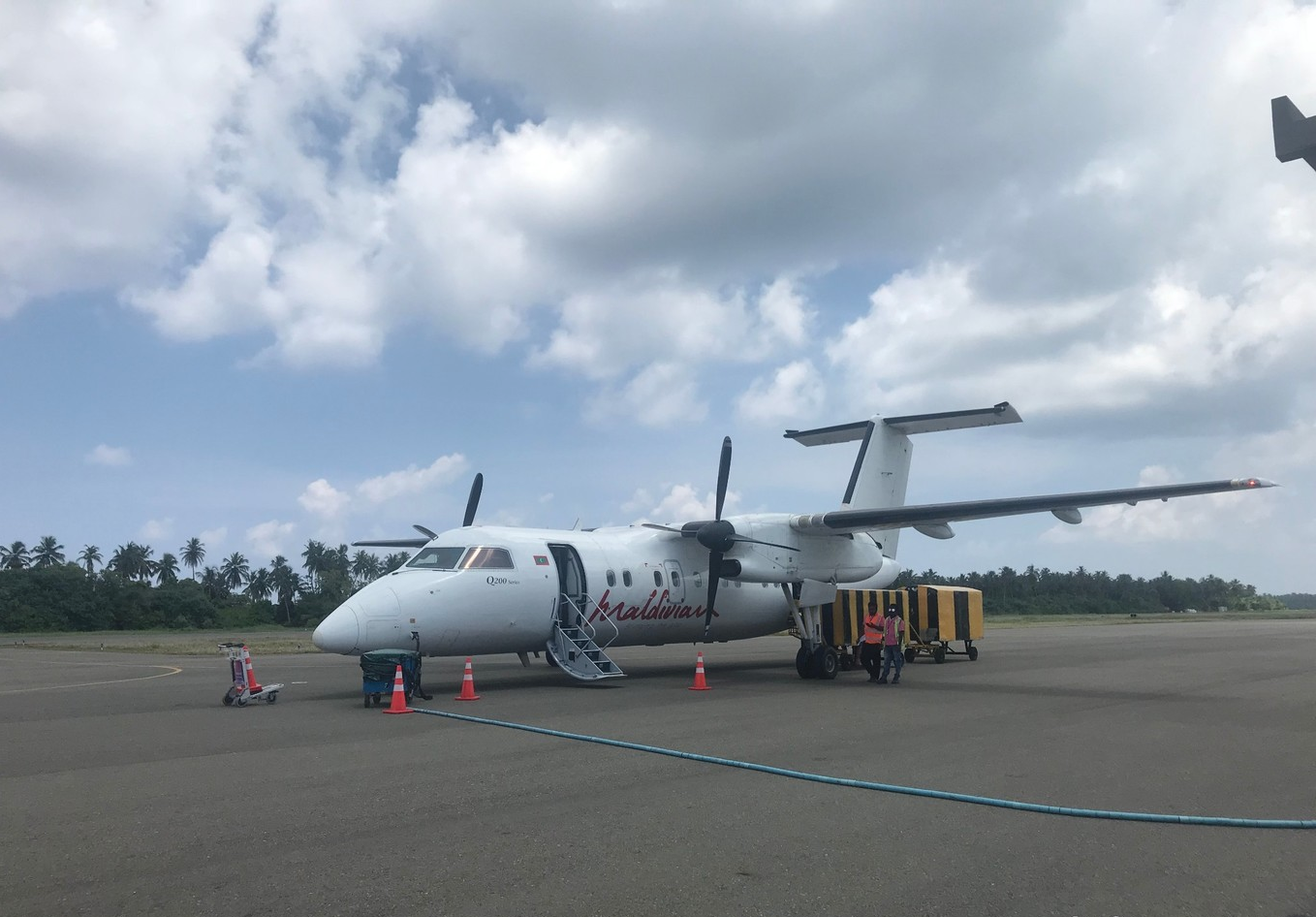 达到马累机场后,由于柏悦岛在机场没有接机柜台,所以都是由酒店小黑举牌接机,需要耐心在机场寻找一下。如果需要在马累入住一晚,酒店会安排到住宿酒店的接机服务,然后第二天再到机场候机,搭乘国内航班到Kooddoo Domestic Airport,再转乘快艇40分钟。