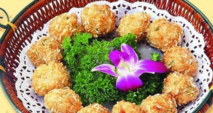 炸鱼球是马尔代夫一道非常有名的美食。食用时,用生菜包的菜叶包裹着鱼球再加上蚬蚧汁,口味香甜独特。