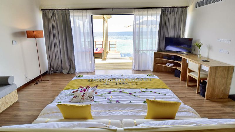 圣塔拉富士岛酒店处于一个原始的岛上,搭乘快艇自马累机场仅15分钟的路程。是泰国圣塔拉酒店集团在马尔代夫开的第二家酒店,跟中央格兰德属姊妹岛,也是一价全包,是以前的魔芋岛Giraavaru被圣塔拉集团买下来重新装修的,所有建筑均为新建的。这个度假胜地拥有140间面向成人的别墅,位于大海边或壮丽的泻湖上,确保客人拥有一个宁静奢华的度假体验。沙屋到大海的距离为是10~15米左右。圣塔拉富士岛酒店提供24小时客房服务,亦有6间给客人提供餐饮服务的内部酒吧和餐厅。