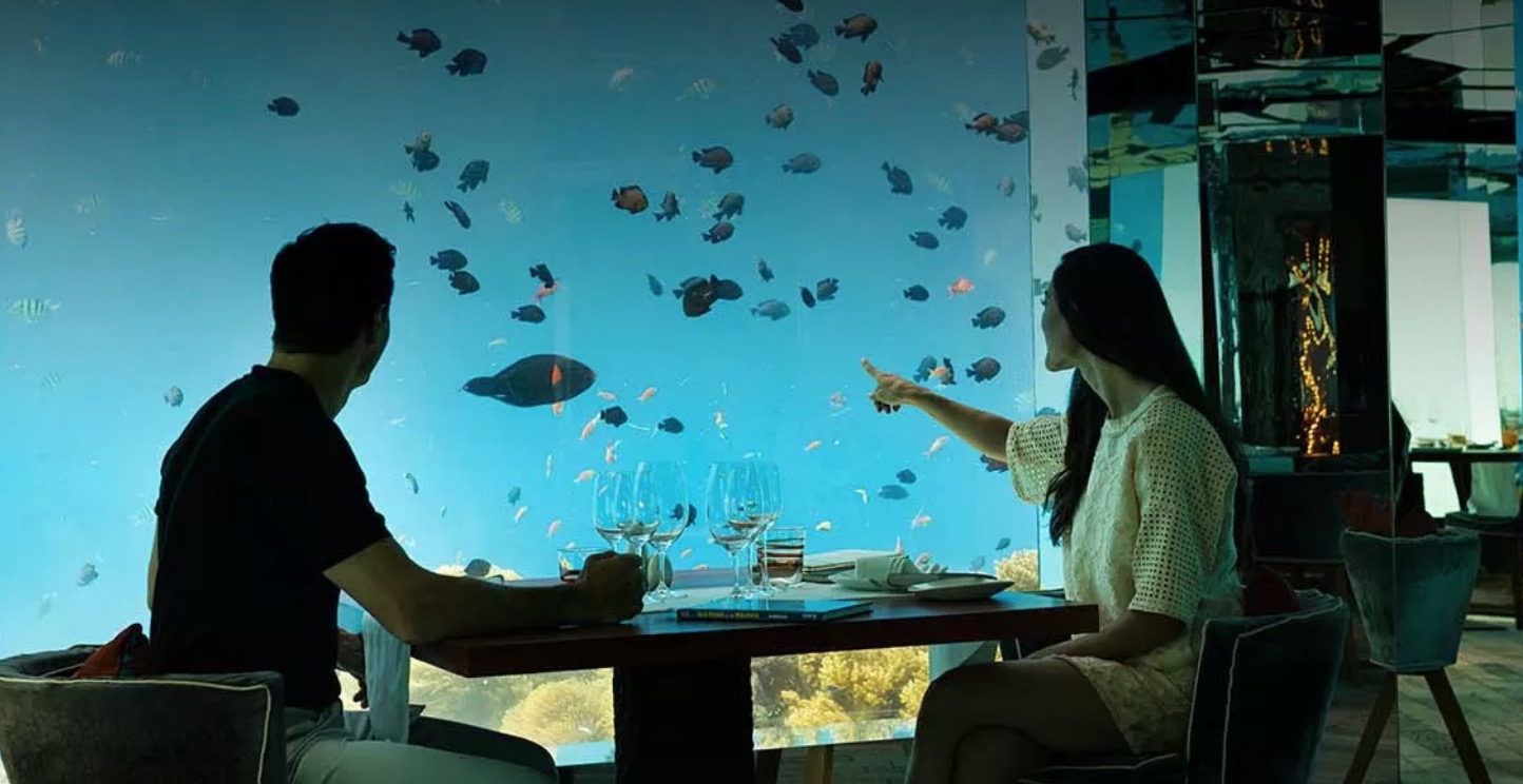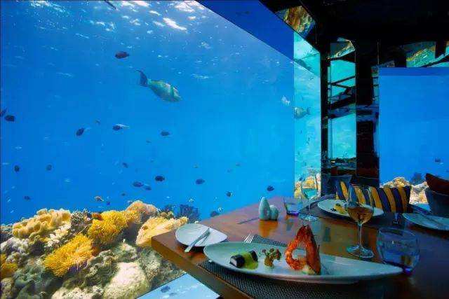 海底世界神秘又丰富,有多少人想去一窥究竟,但是考个潜水证又太麻烦,时间精力可能都不太够,那怎么办呢?你知道海底餐厅吗?海底餐厅,是指位于海平面以下的餐馆,餐厅外层是透明的有机玻璃,边吃美食边欣赏海底世界,非常奇妙。马尔代夫目前共有五个岛有海底餐厅。