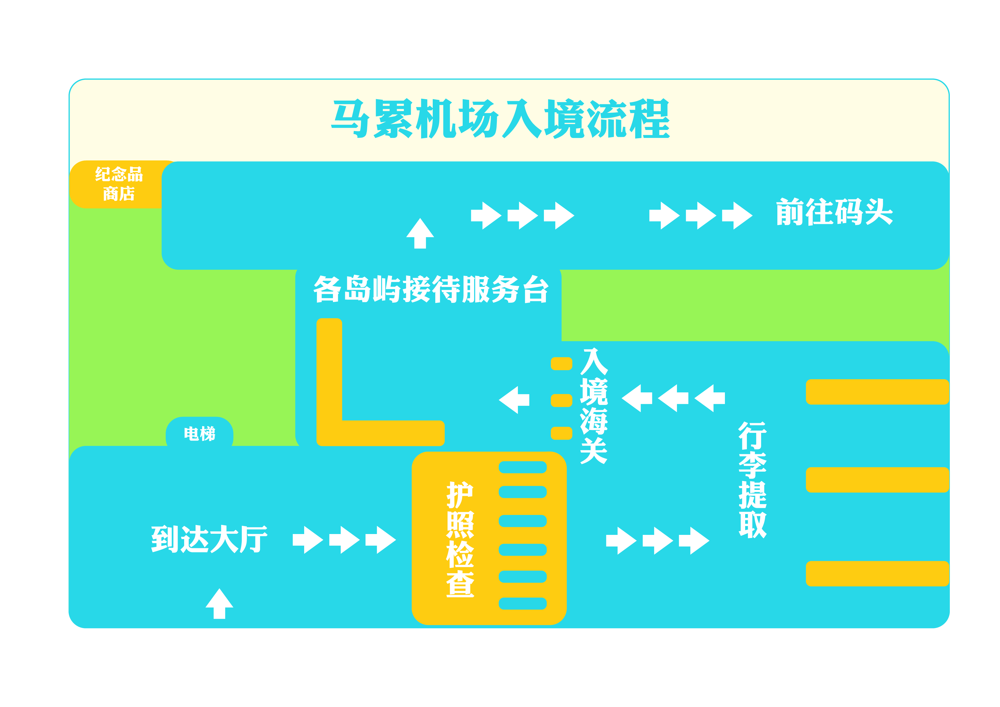 这张图就是马累机场入境后的平面图了,把现场的情况大概表明了,大家可以收藏。