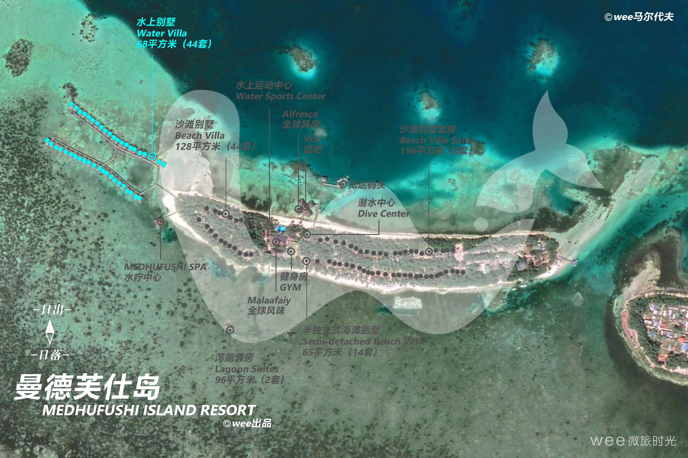 面朝日出或朝向日落的水上别墅位于泻湖水晶般清澈的大海之上。卧室设有落地窗,从卧室的玻璃窗可以观赏到海洋迷人的风景,拥有大床房或双床房,独立的浴缸和淋浴设施,私人室外走廊,大庭院及小道通向海滩,马尔代夫式的秋千,阳光休闲区。