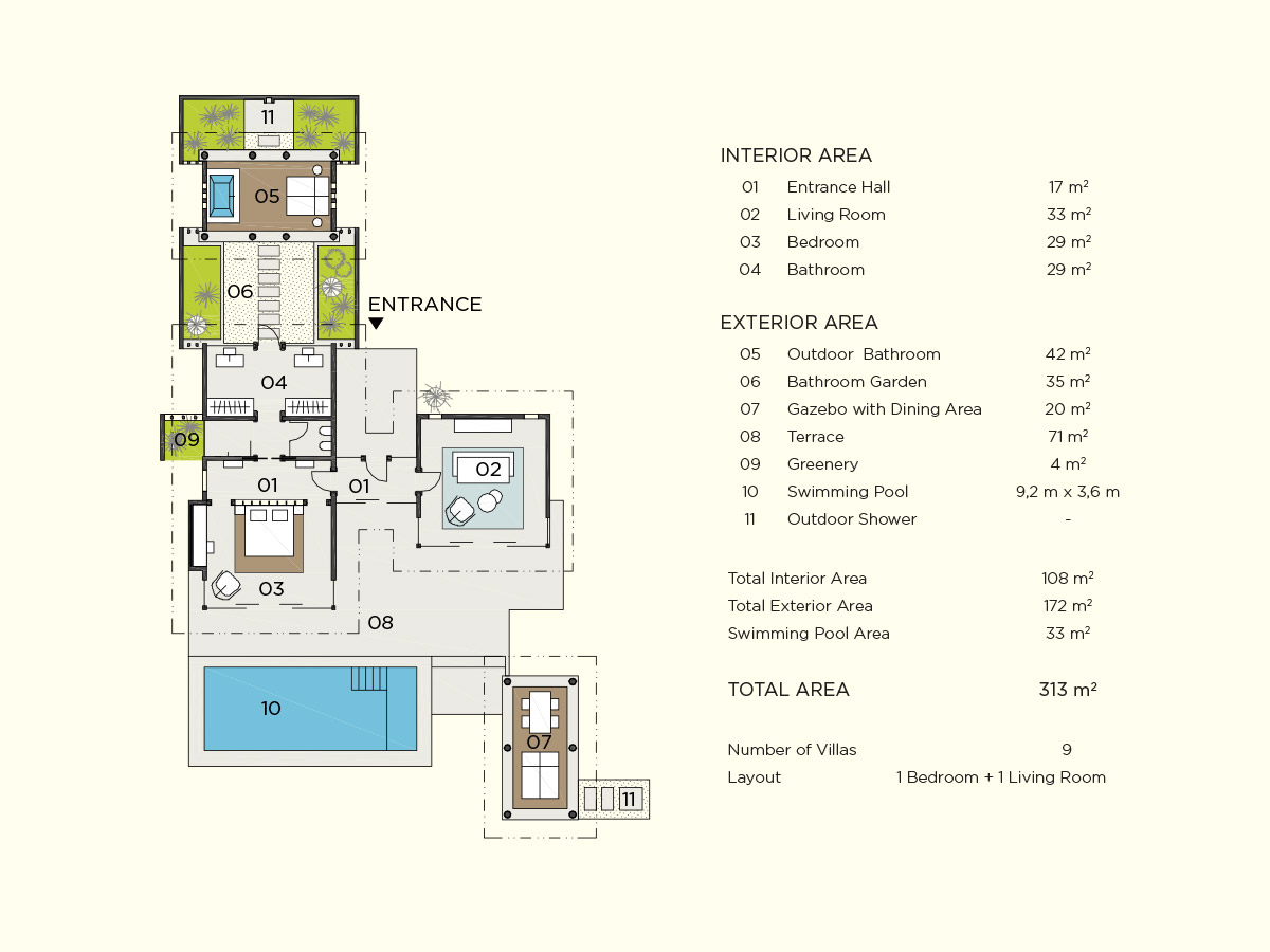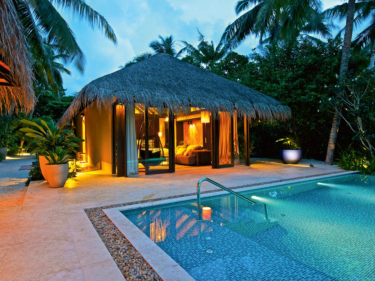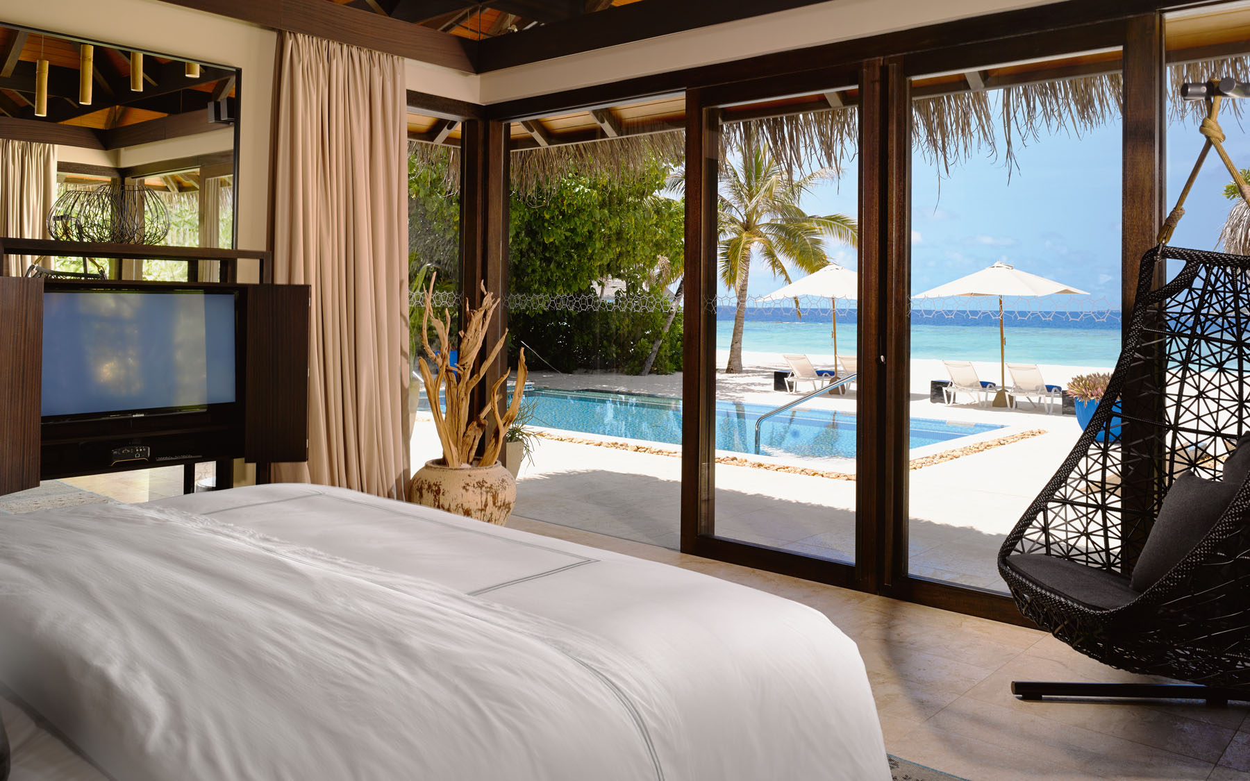 豪华海滩泳池别墅室内设计采用天然材料与色彩,充满素雅自然之风,悬挂椅平添一丝灵动与趣味。充满禅宗格调的户外浴室配备超大浴池和甲板,经由中庭花园可来到一处圆柱形礼台,礼台下方设一张舒适躺椅。位于泳池边的露天用餐区是日落时分的最佳休息之地。