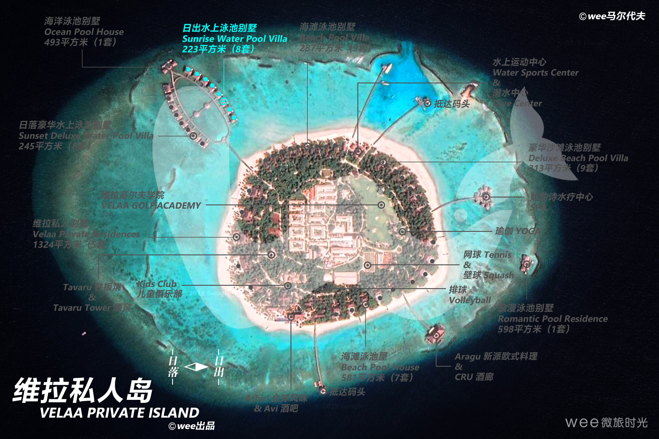 日出水上泳池别墅沿着一处长长的码头依次排开,呈美丽的月牙状,可览尽印度洋和私人泳池的旖旎风光。屋顶垂下的茅草为用餐区洒下一片阴凉,卧室和浴室连着露台、泳池和阳光甲板,更有直接通往诱人海中的阶梯。别墅内部,舒适怡人的起居室装有落地观景窗,床铺正对着壮观无垠的印度洋。