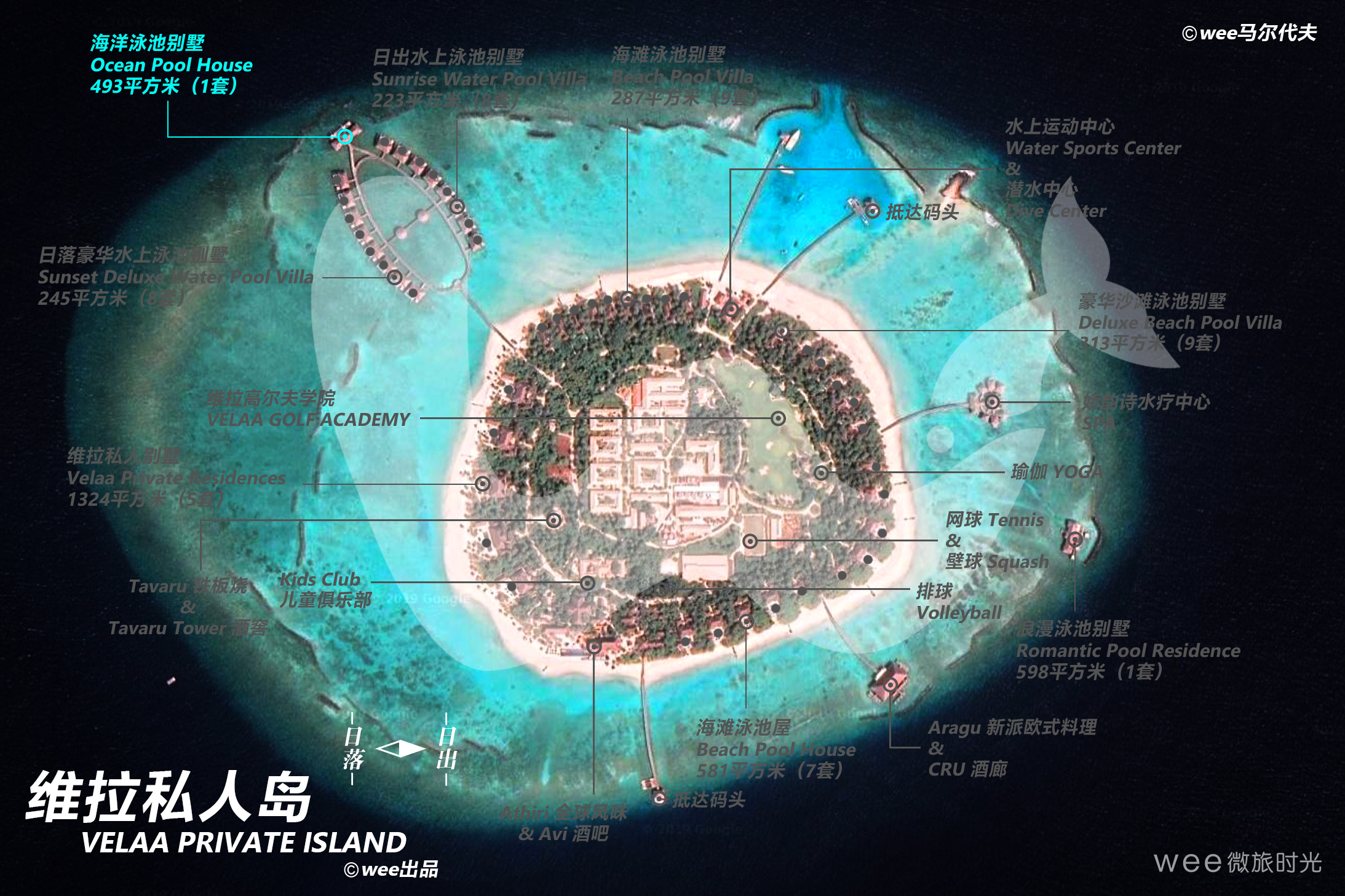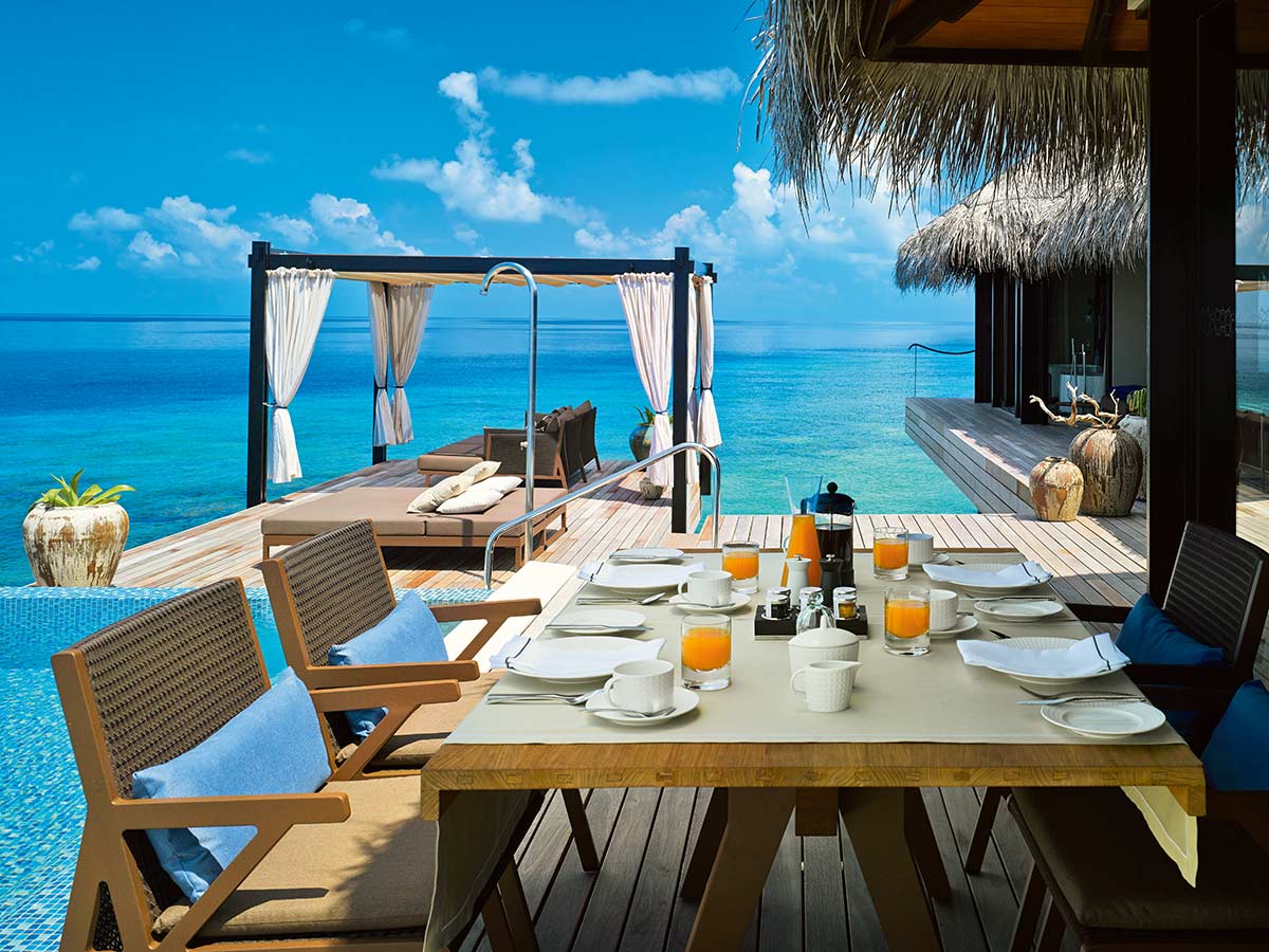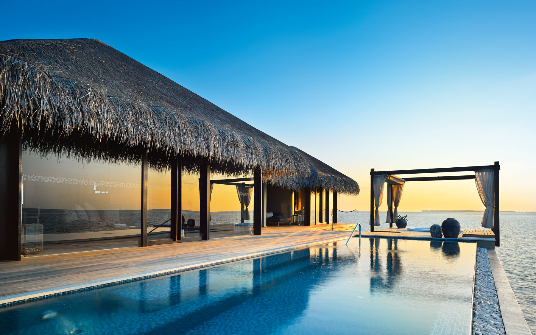 海洋泳池别墅位于岛屿的尖端,拥有得天独厚的私密性,双卧水上屋装饰着传统风格茅草,居住空间充满精心打造的典雅元素。用餐区占据房屋的中央位置,两间宽敞的浴室配备循环浴缸,卧室的装修风格十分典雅,无论置身何地,都能看见海洋的身影。在私人泳池中舒展身姿,在阳光甲板上放松歇息,或干脆直接投入泻湖的怀抱中,都感觉妙不可言。两座凉亭下是放松疲惫身心的理想地点:一座设有下沉式热水浴池,另一座配备舒适躺椅。