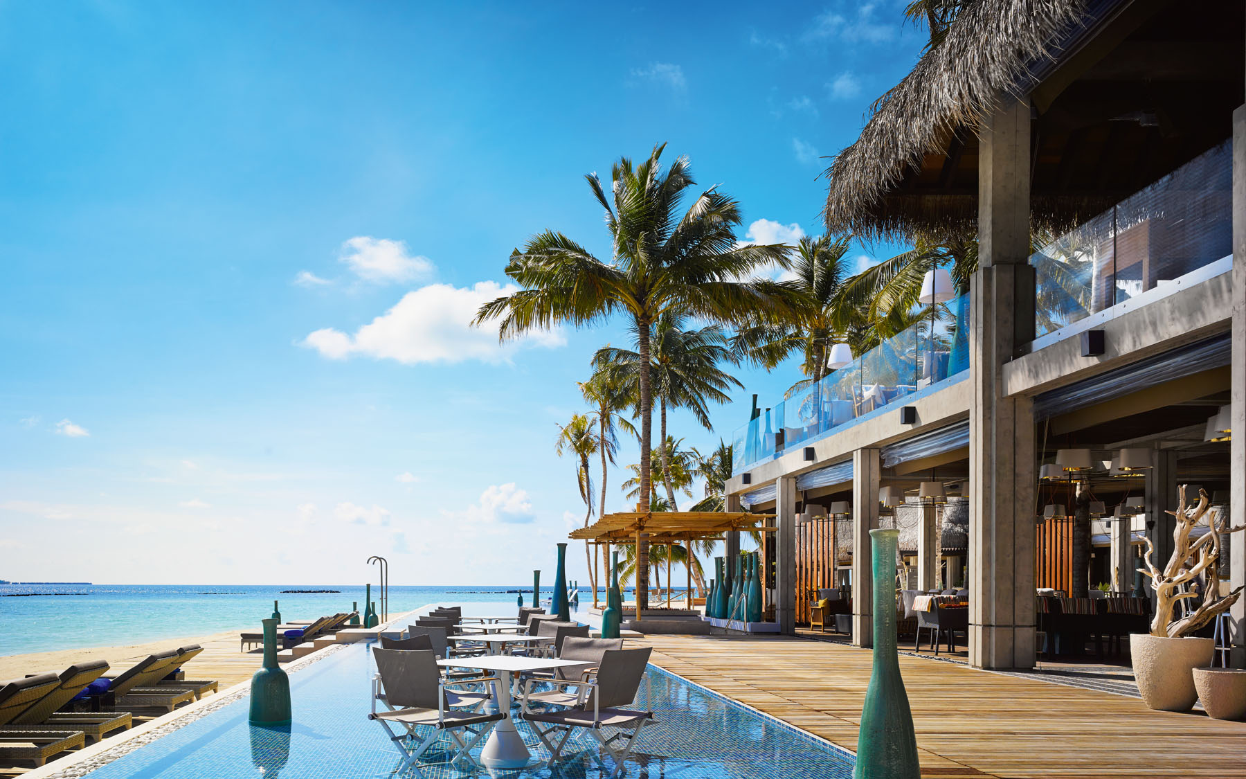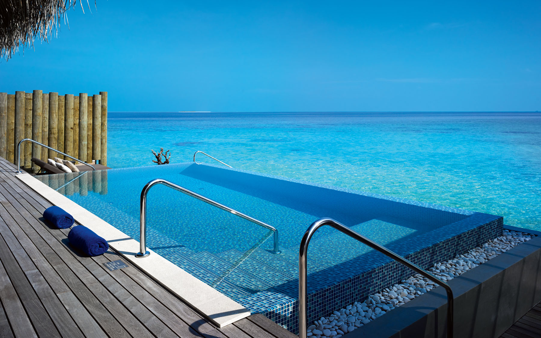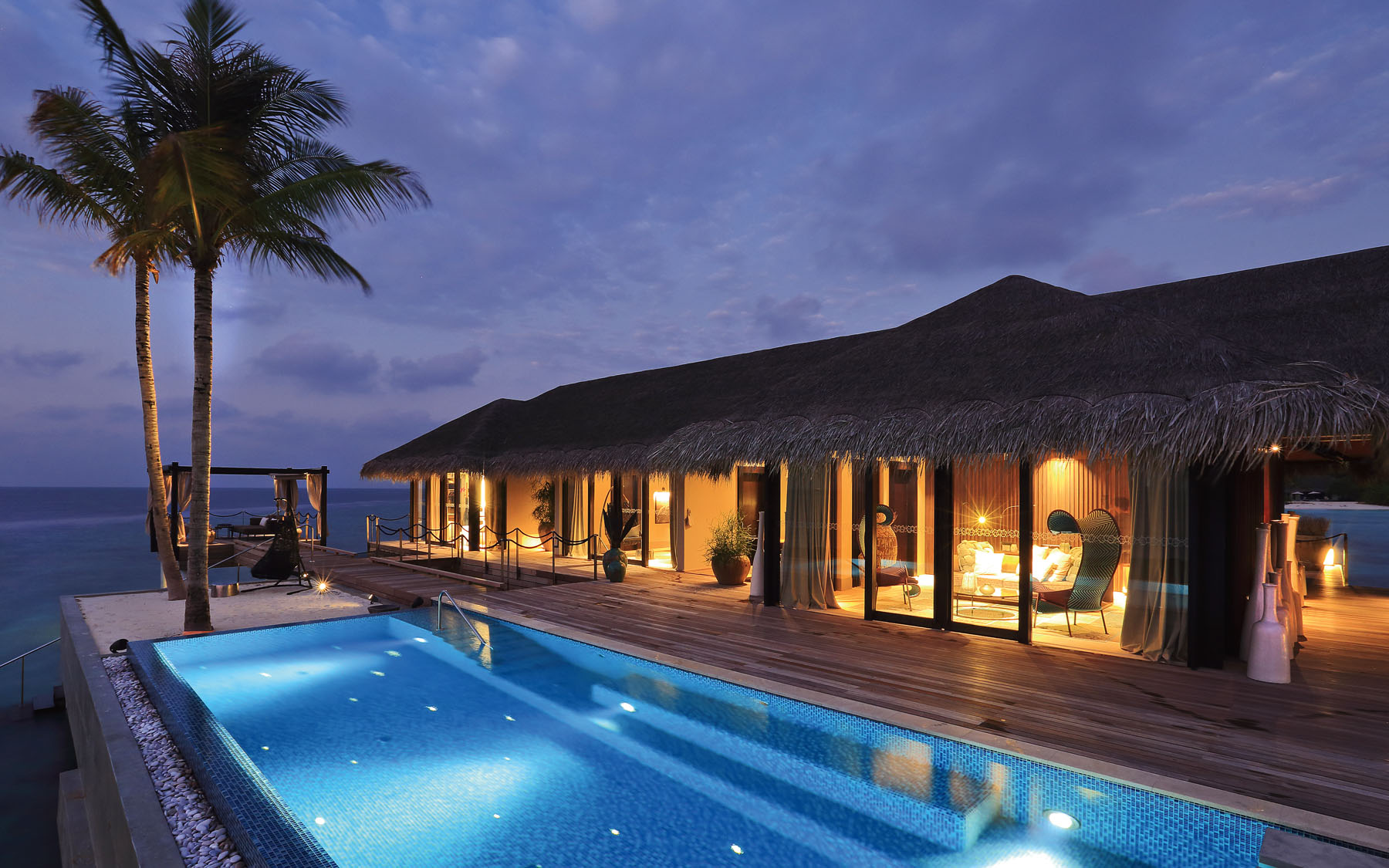 日出水上泳池别墅沿着一处长长的码头依次排开,呈美丽的月牙状,可览尽印度洋和私人泳池的旖旎风光。屋顶垂下的茅草为用餐区洒下一片阴凉,卧室和浴室连着露台、泳池和阳光甲板,更有直接通往诱人海中的阶梯。别墅内部,舒适怡人的起居室装有落地观景窗,床铺正对着壮观无垠的印度洋。