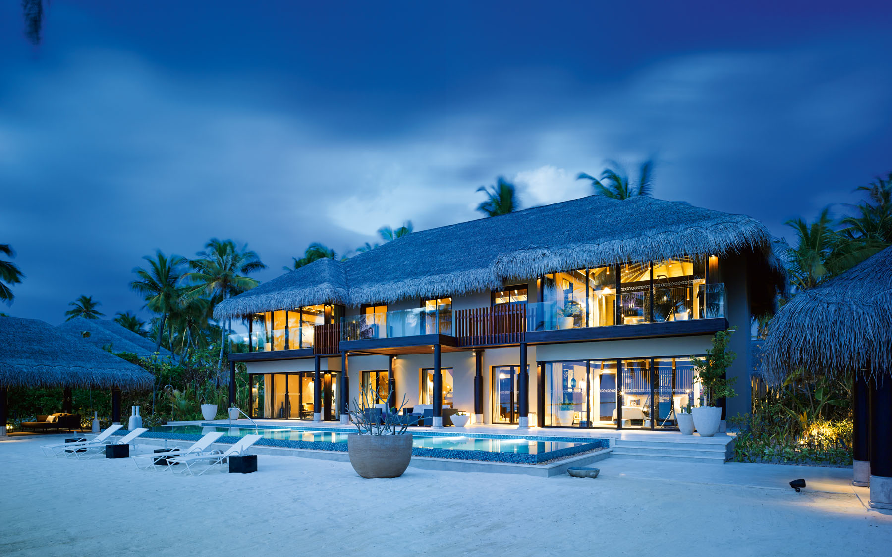 海滩泳池屋静静地卧在葱茏的植物族群中,两侧是随风轻轻摇曳的棕榈树,双卧海滩住屋是家庭下榻的理想寓所。宽敞的起居区白天可供休息放松,傍晚则是热闹的社交活动场所。起居室与配备有酒吧和高脚凳的厨房区彼此相连,为正式招待客人或非正式的社交活动(仅提供零食或膳食)提供理想地点。