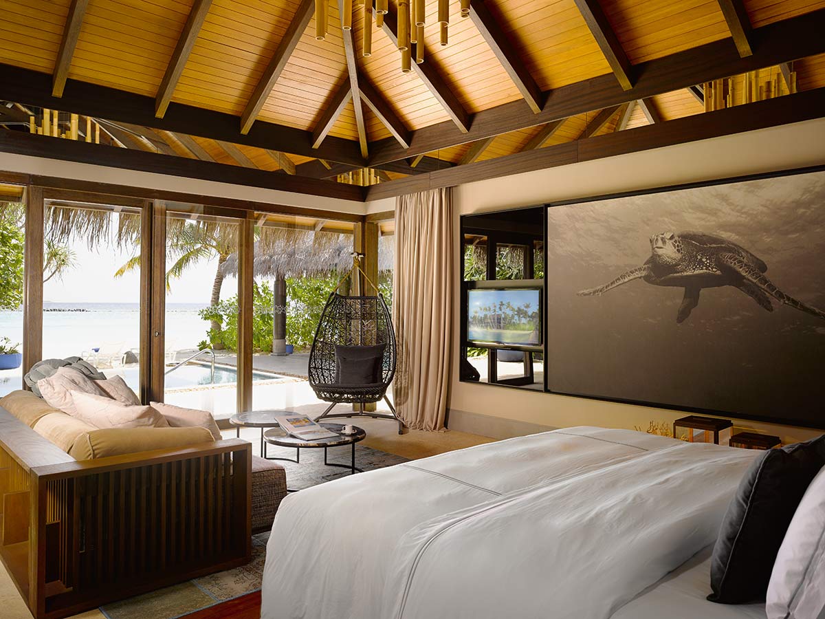 海洋泳池别墅位于岛屿的尖端,拥有得天独厚的私密性,双卧水上屋装饰着传统风格茅草,居住空间充满精心打造的典雅元素。用餐区占据房屋的中央位置,两间宽敞的浴室配备循环浴缸,卧室的装修风格十分典雅,无论置身何地,都能看见海洋的身影。