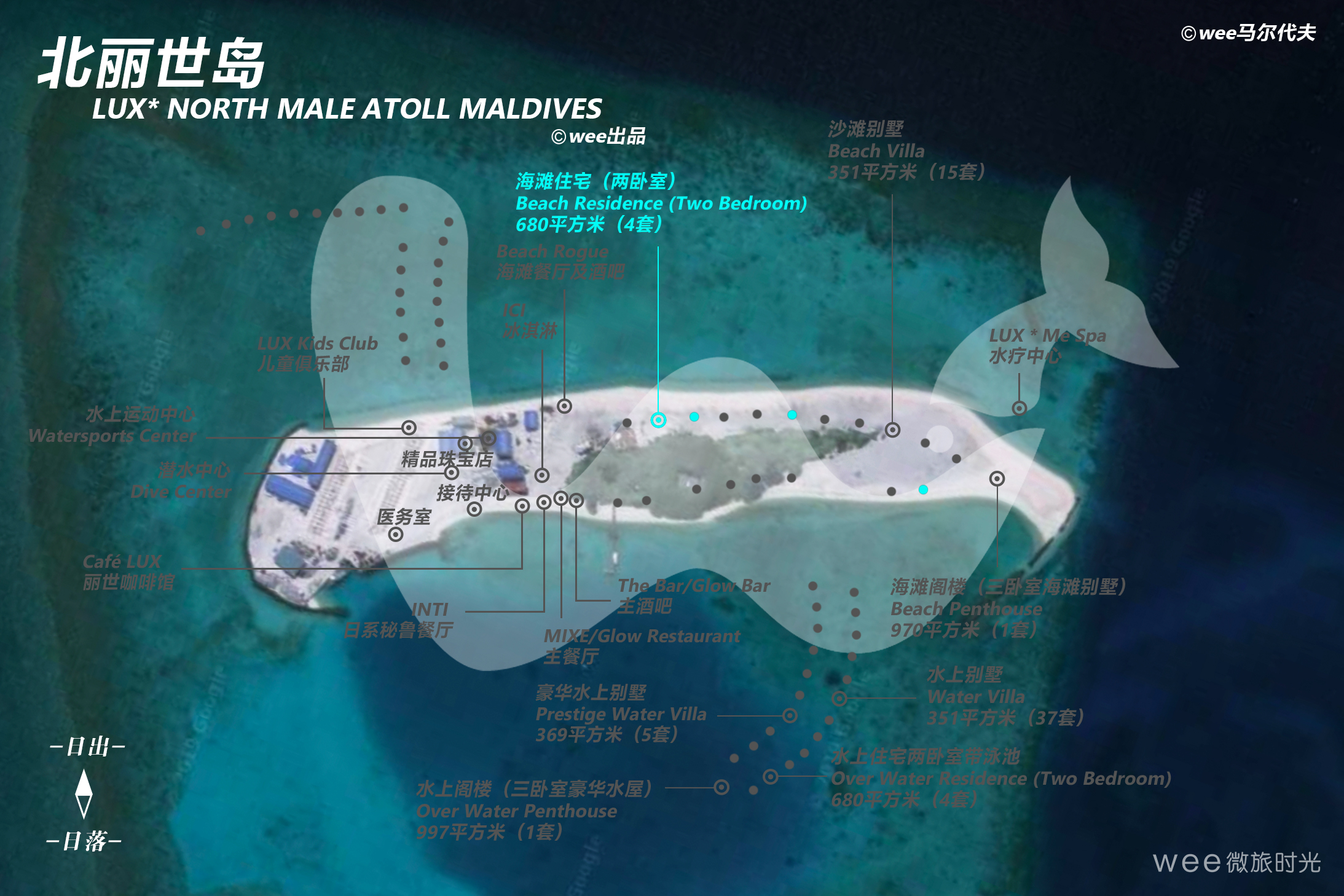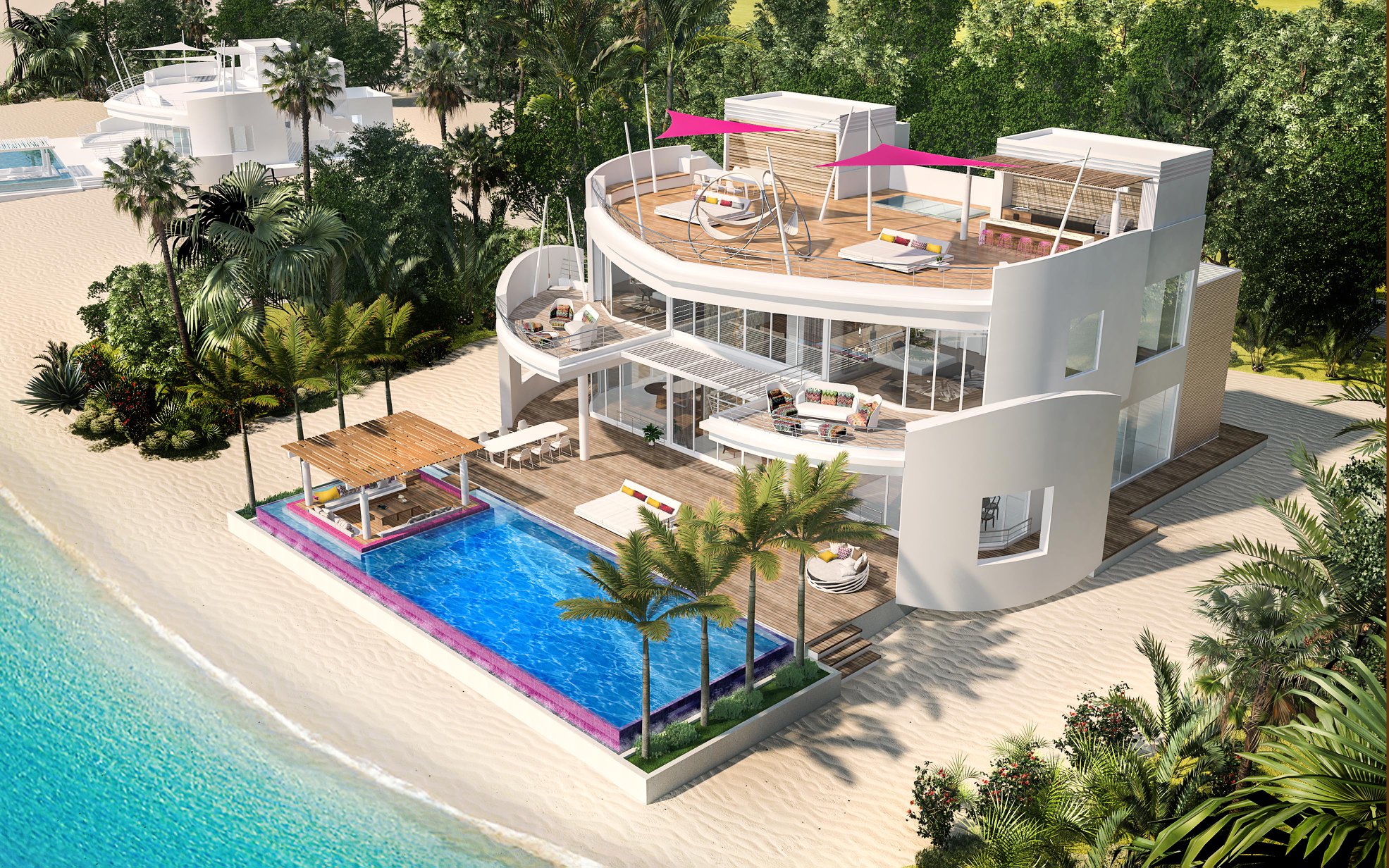 双卧别墅坐落在白色沙滩上,拥有大型私家泳池和宽敞的屋顶天台。