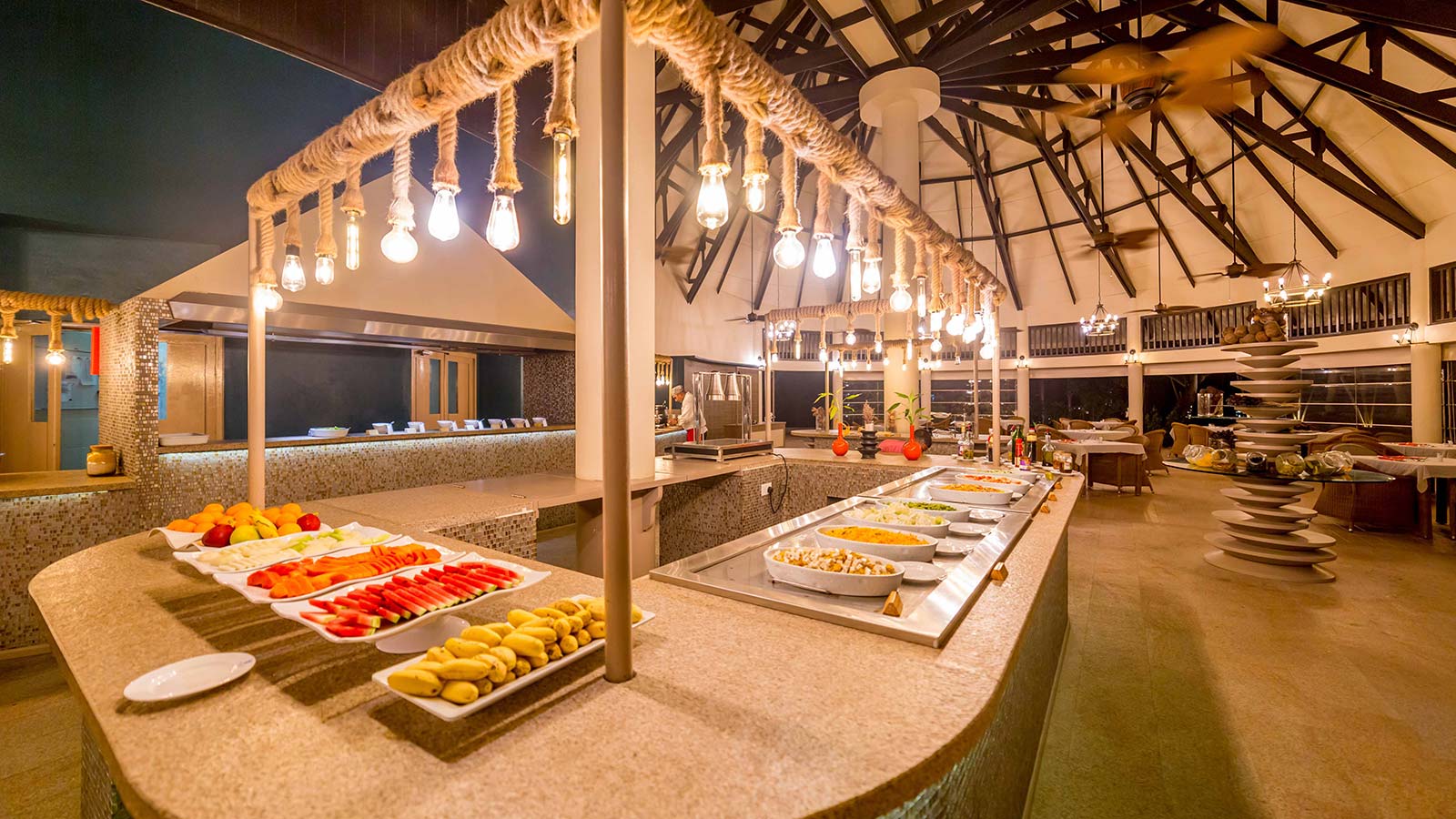 Malaafaiy 餐厅供应诱人的自助餐,由当地马尔代夫美食和世界各地的菜肴组成一场美食盛宴,在时尚的环境中供应早餐,午餐和晚餐。在此可以享受华丽的天气和壮观的景色,为所有客人创造了一个温暖、热情的氛围。